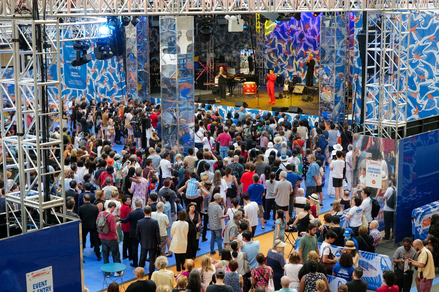 当地时间7月26日,纽约林肯中心举行“上海日”活动,通过10余场演出和文化市集,向观众展现海派风韵。图为纽约林肯中心中央舞池上演《音乐嘉年华》演出。(图片来源:中新社)