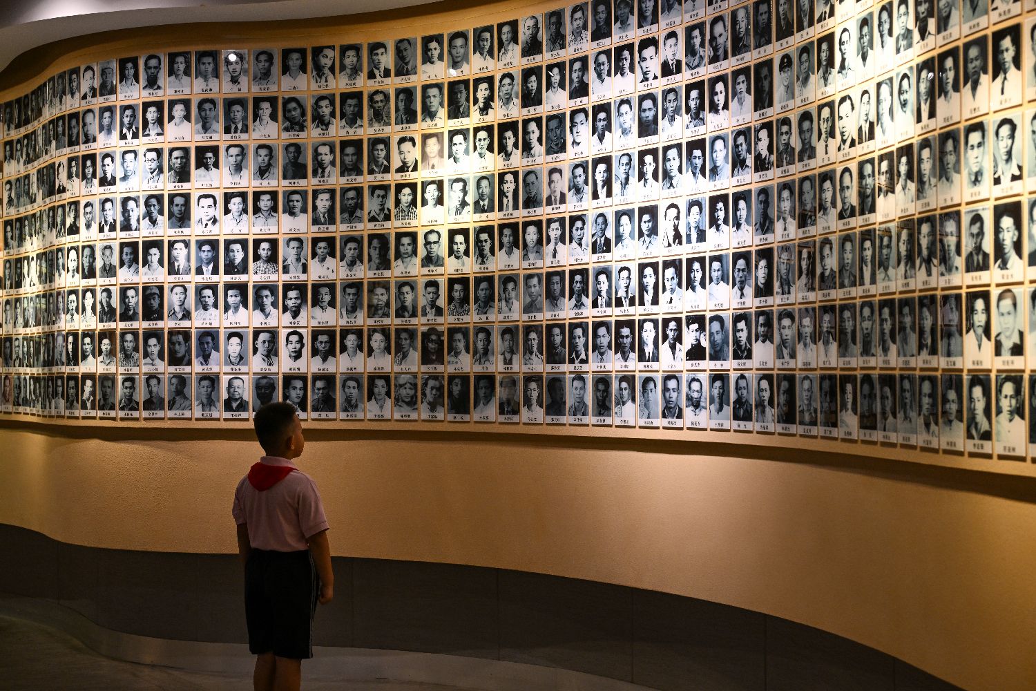 7月27日,一名小朋友佩戴红领巾站在南洋华侨机工英雄墙前。