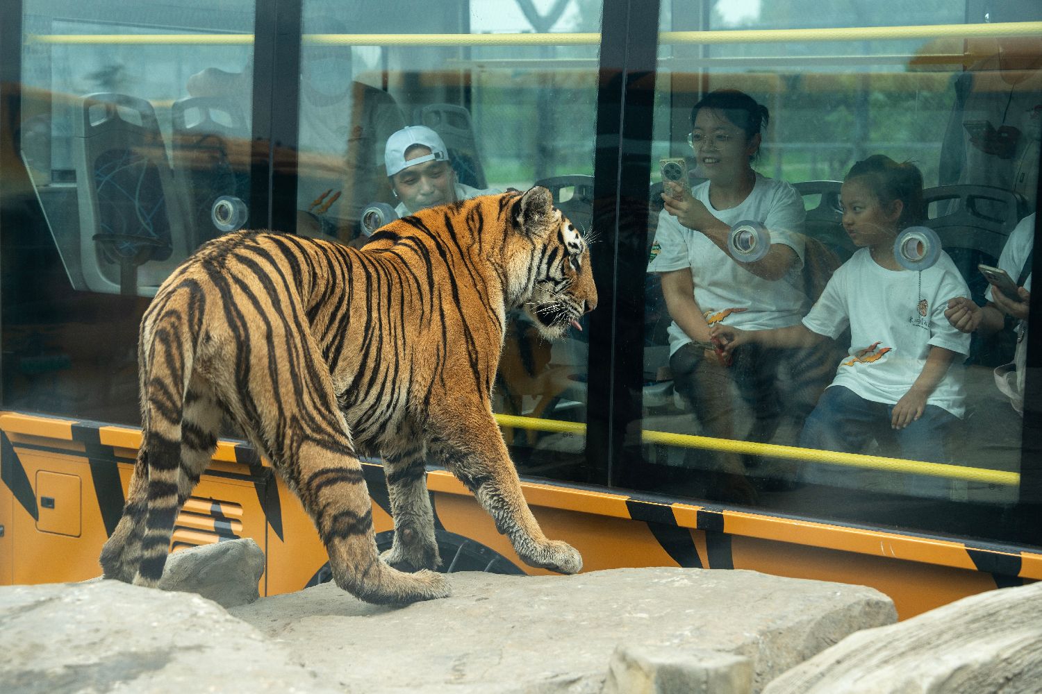 7月29日是第15个“全球老虎日”,位于哈尔滨的黑龙江东北虎林园启动“东北虎的世界世界的东北虎”主题系列活动。图为游客在车内观赏东北虎。