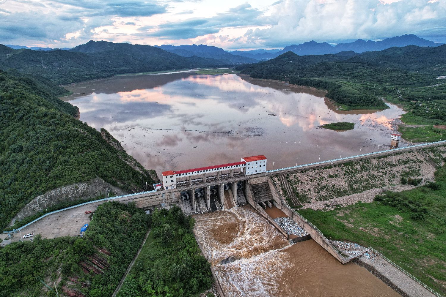 7月29日,航拍天津蓟州杨庄水库行洪。天津市水务部门通报,杨庄水库遭遇1956年建站以来最大洪峰,通过精准调度泄水保障水库和泃河的行洪安全。(图片来源:中新社)