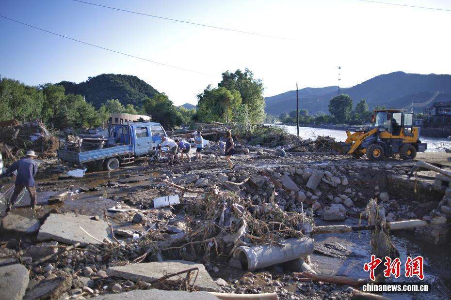 7月29日,天津市蓟州区下营镇下营村青年桥畔,工作人员清理被洪水冲倒的树木及杂物。(图片来源:中新网)