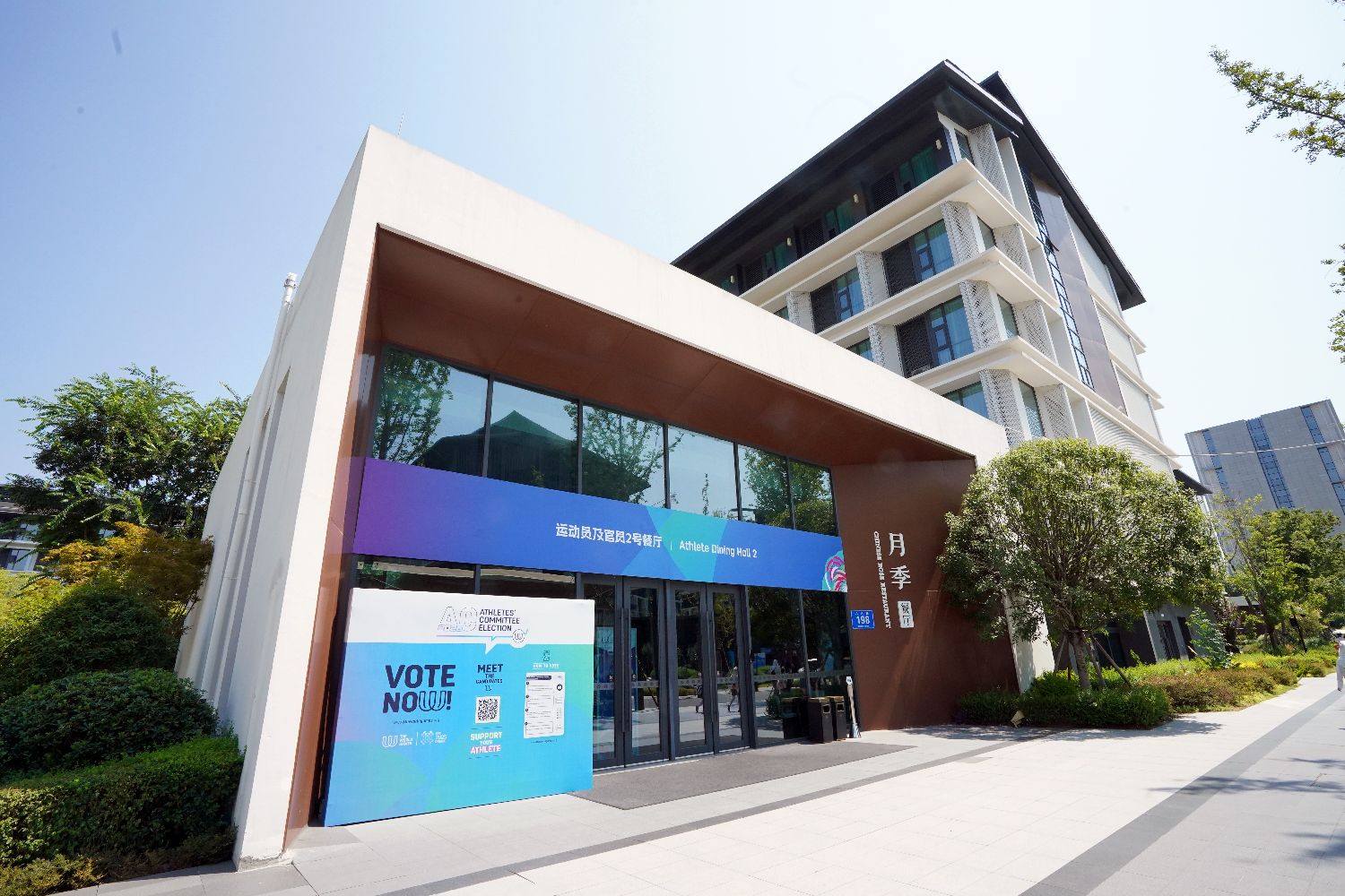 成都世运村分为A、B两区,世运村设置运动员及官员餐厅、注册中心、参赛者服务中心、医疗室、中医理疗中心、健身房、居民服务中心、母婴室、称重中心、缝制中心、竞赛会议室、兴奋剂检查站、反兴奋剂教育拓展站、文化活动区等,实现住宿、餐饮、参赛者服务、注册、竞赛、文化、商业休闲、物流、收费等服务保障功能。图为官员及运动员餐厅外景。