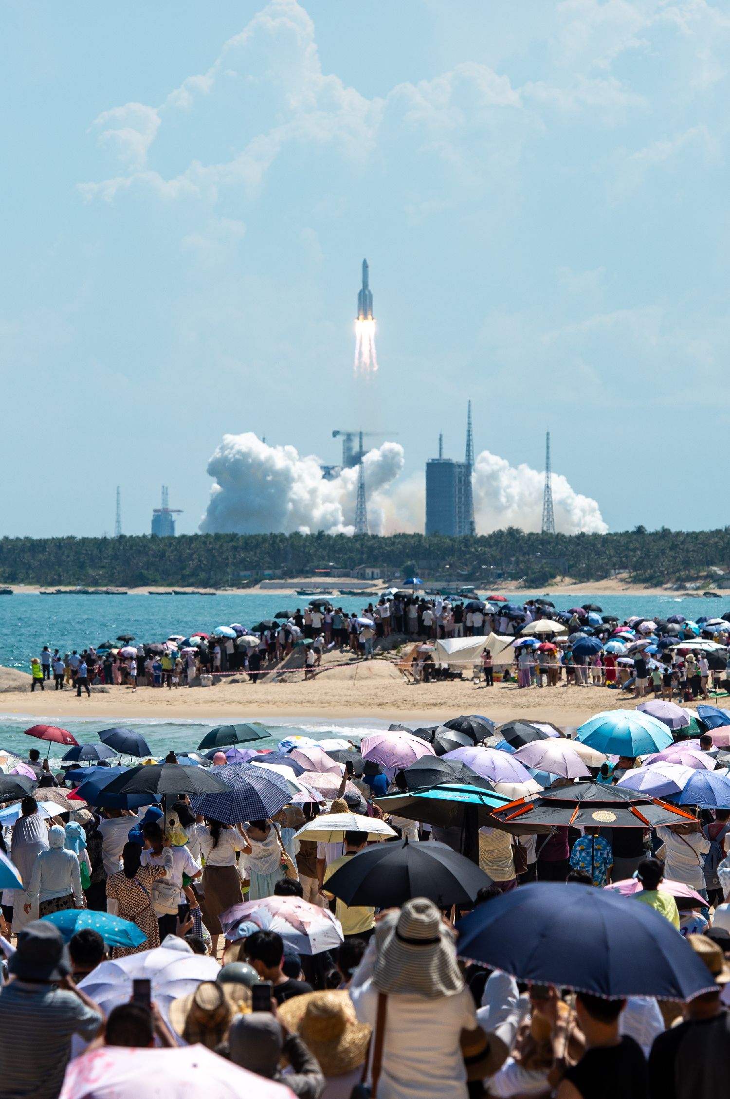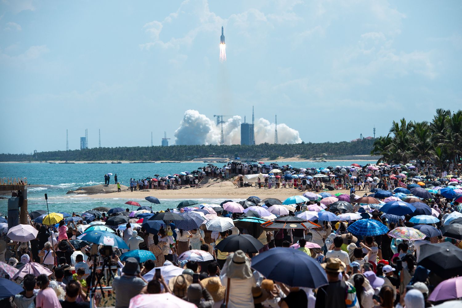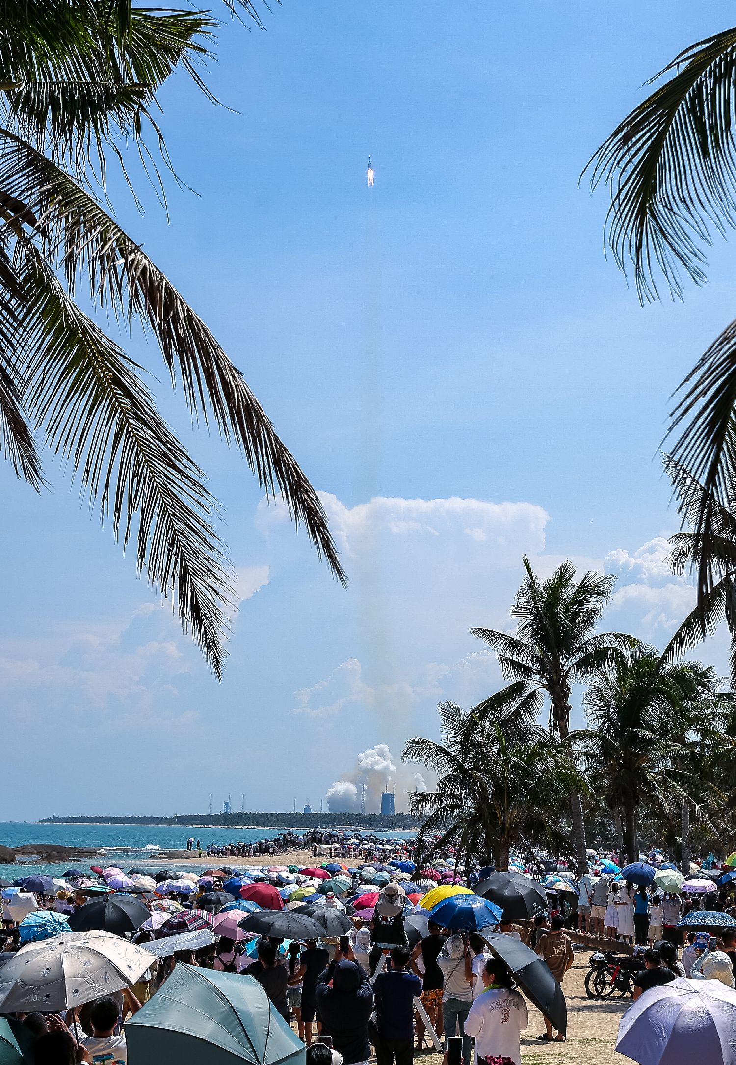北京时间13日14时43分,中国在文昌航天发射场使用长征五号乙运载火箭/远征二号上面级,成功将卫星互联网低轨08组卫星发射升空,卫星顺利进入预定轨道,发射任务获得圆满成功。图为民众在文昌淇水湾海滩观看长征五号乙运载火箭/远征二号上面级点火升空。(本文图片均据中新社)