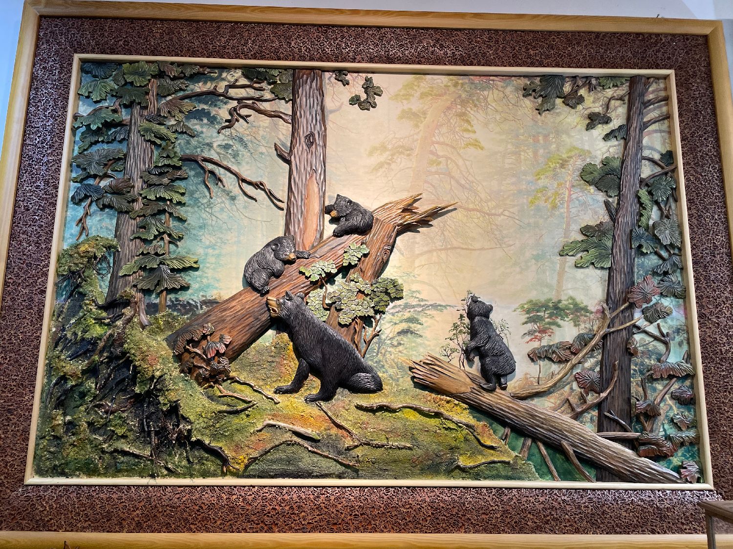 这幅木拼画的灵感来源于19世纪俄罗斯风景画家希施金的油画《松林的早晨》。匠人利用小兴安岭的野生山核桃装点画框,画中的树木、动物都手工雕刻完成。