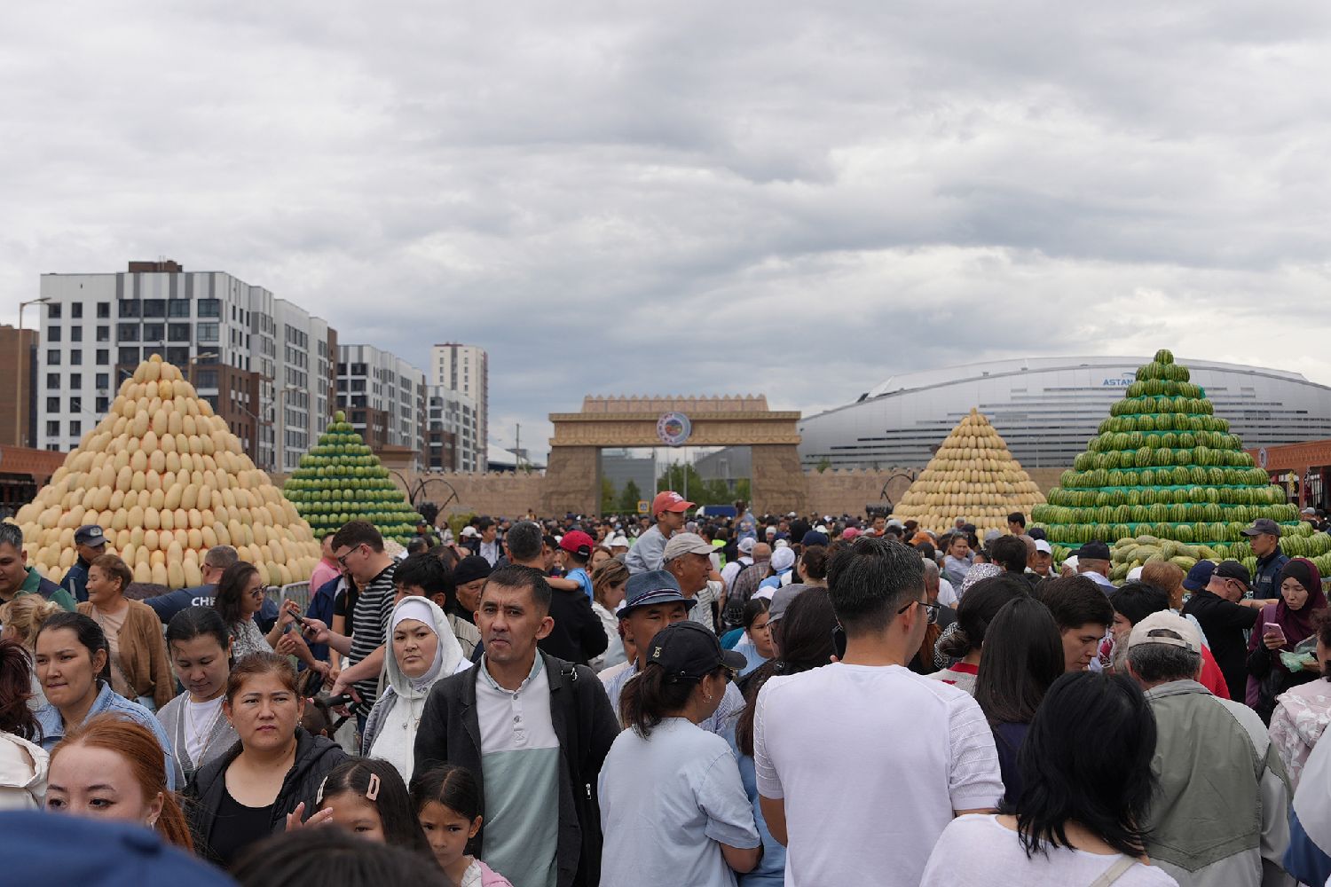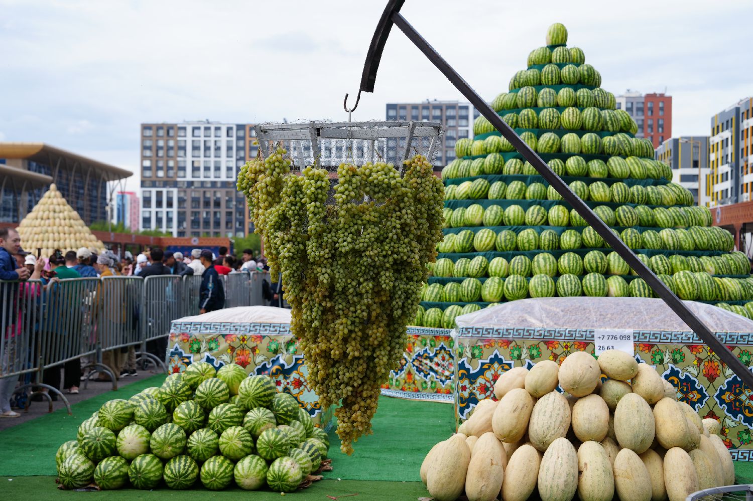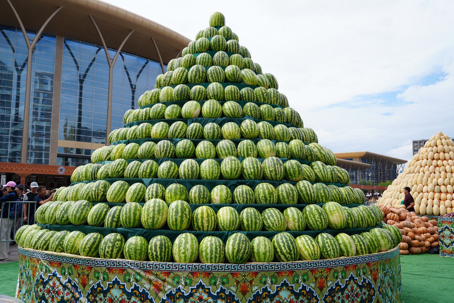 当地时间8月16日,在哈萨克斯坦首都阿斯塔纳,塔吉克斯坦索格特州农产品和手工艺品展销集市在巴里斯竞技场旁举行。图为展销集市上的水果展示区。(图片来源:本文图片均自中新社)