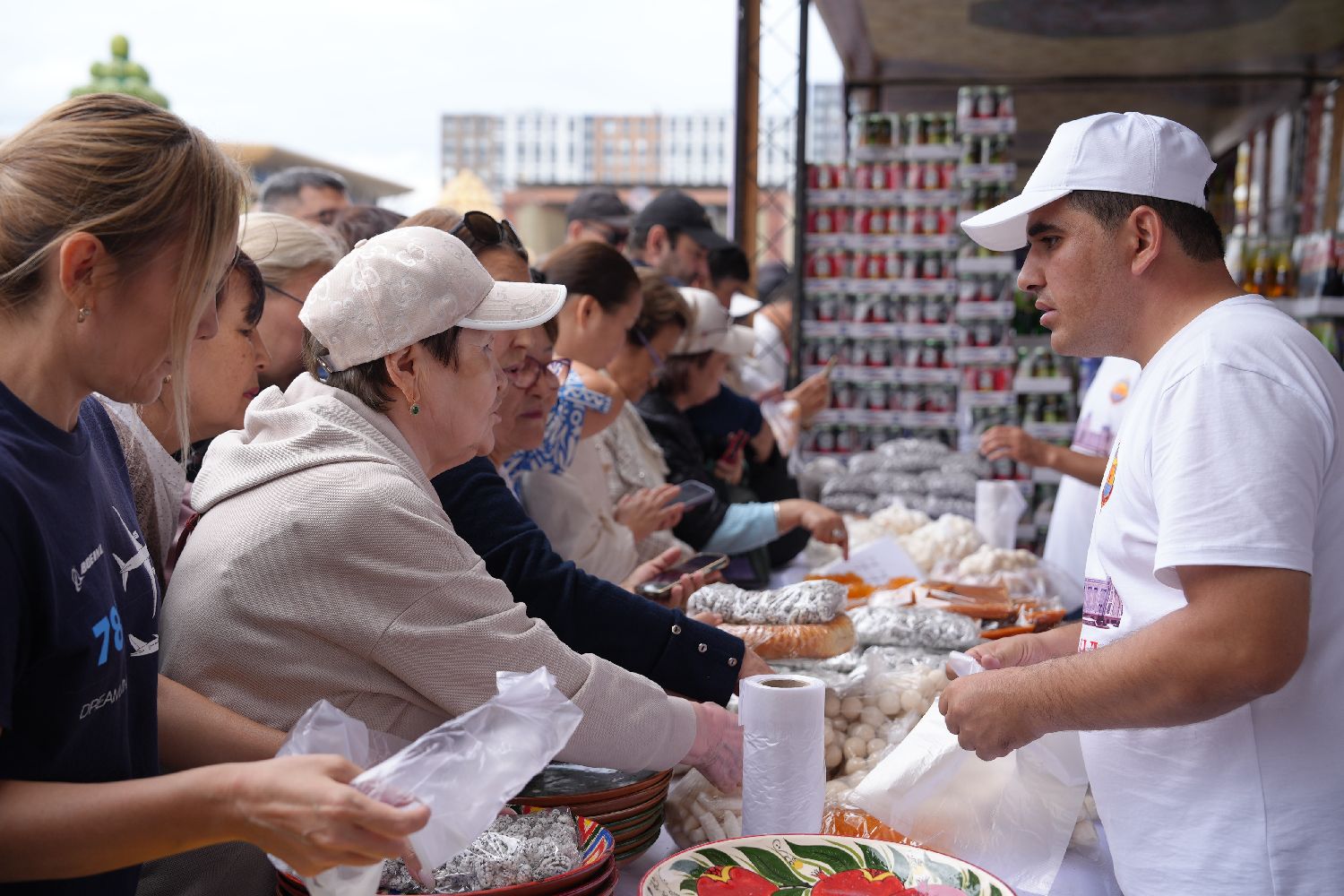 当地时间8月16日,民众在展销集市上选购奶制品、干果等特色食品。