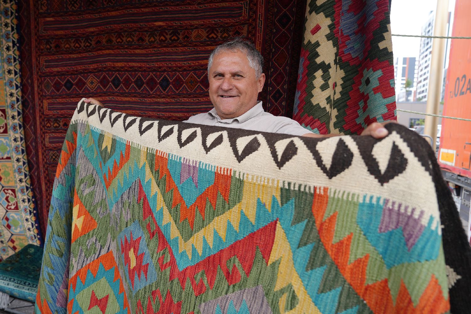 当地时间8月16日,商家在展销集市上展示塔吉克斯坦特色地毯。