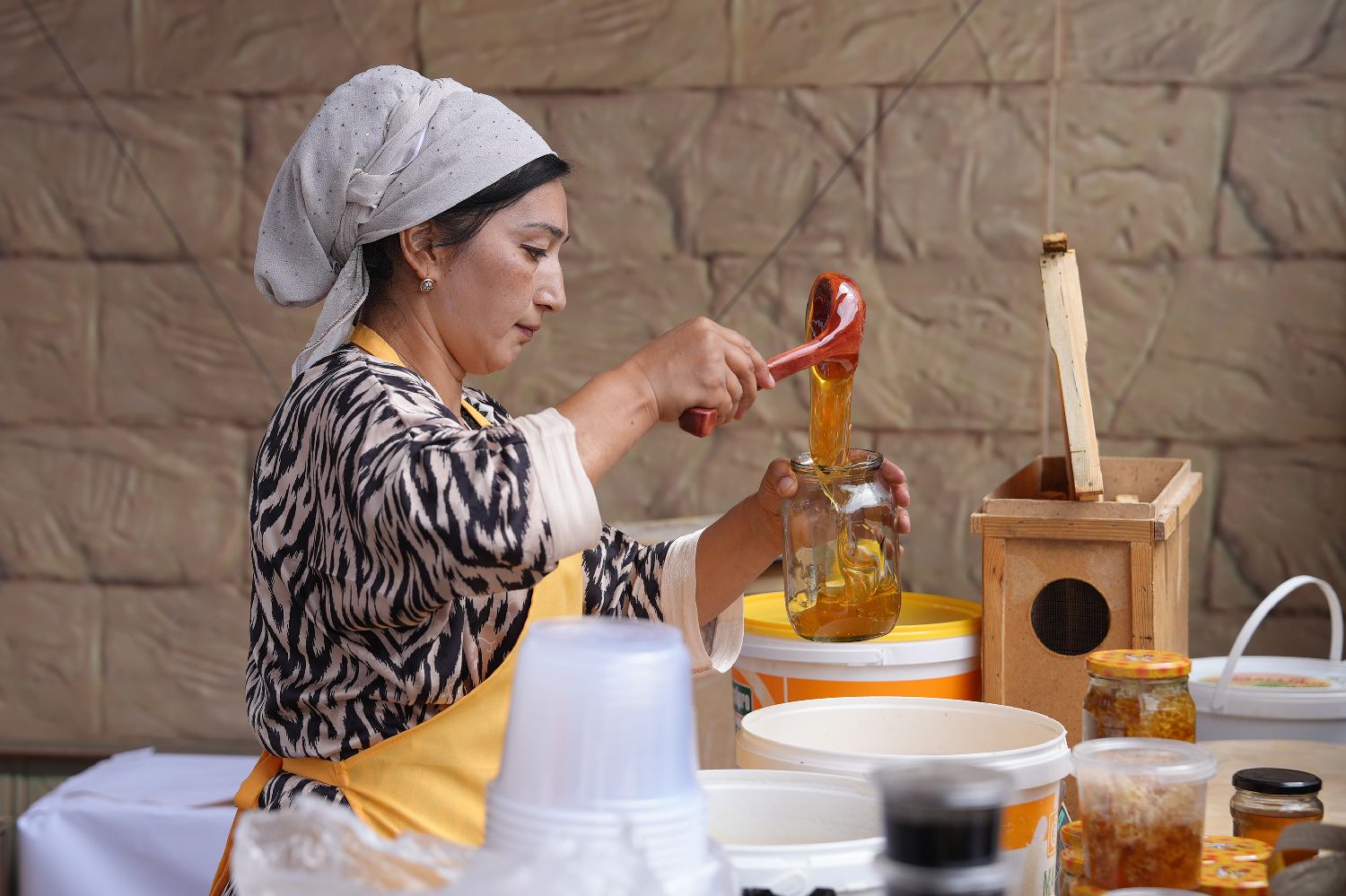 当地时间8月16日,商家在展销集市上现场灌装蜂蜜。
