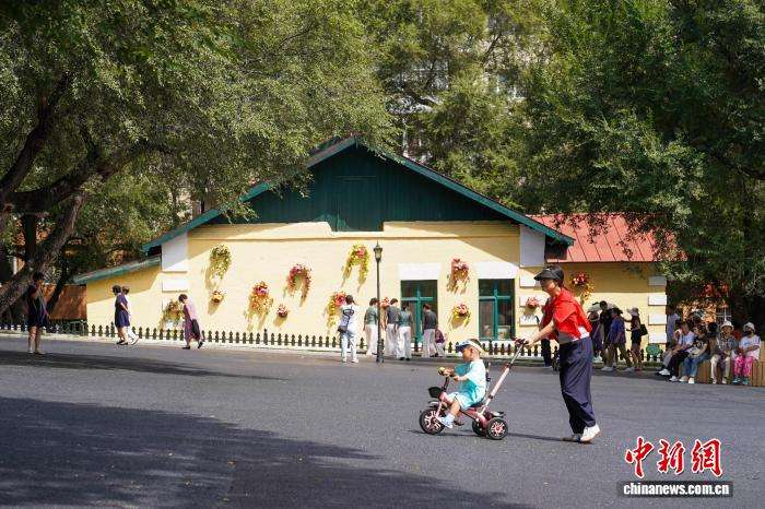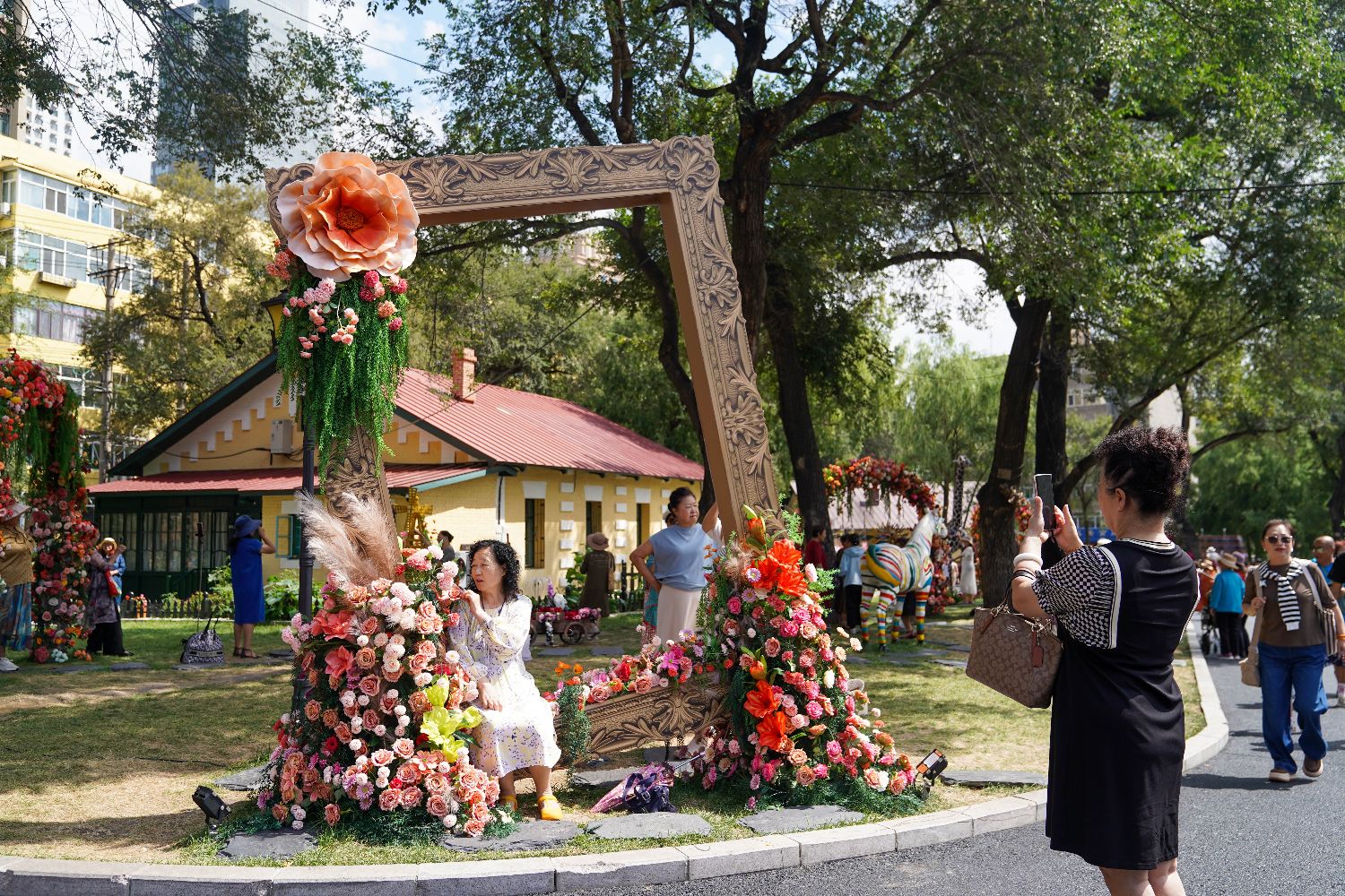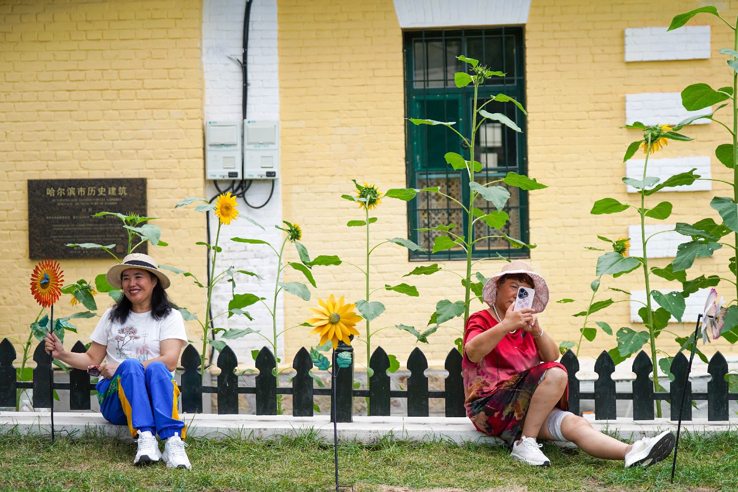 据悉,花园街历史文化街区的核心“黄房子”建筑群落始建于1900年代,曾是哈尔滨欧陆风情的重要缩影。图为8月20日,黑龙江哈尔滨,游人在花园街历史文化街区黄房子前拍照。(图片来源:中新社)