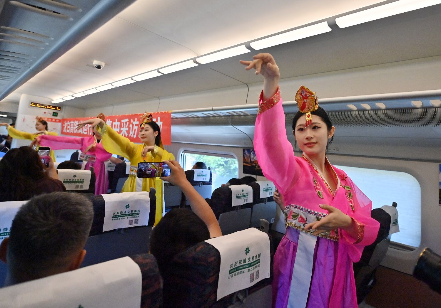作为中国东北高铁网重要组成部分,该线路对畅通区域经济循环、促进沿线旅游资源开发等具有重要作用。图为列车工作人员表演朝鲜族舞蹈。(图片来源:中新社)