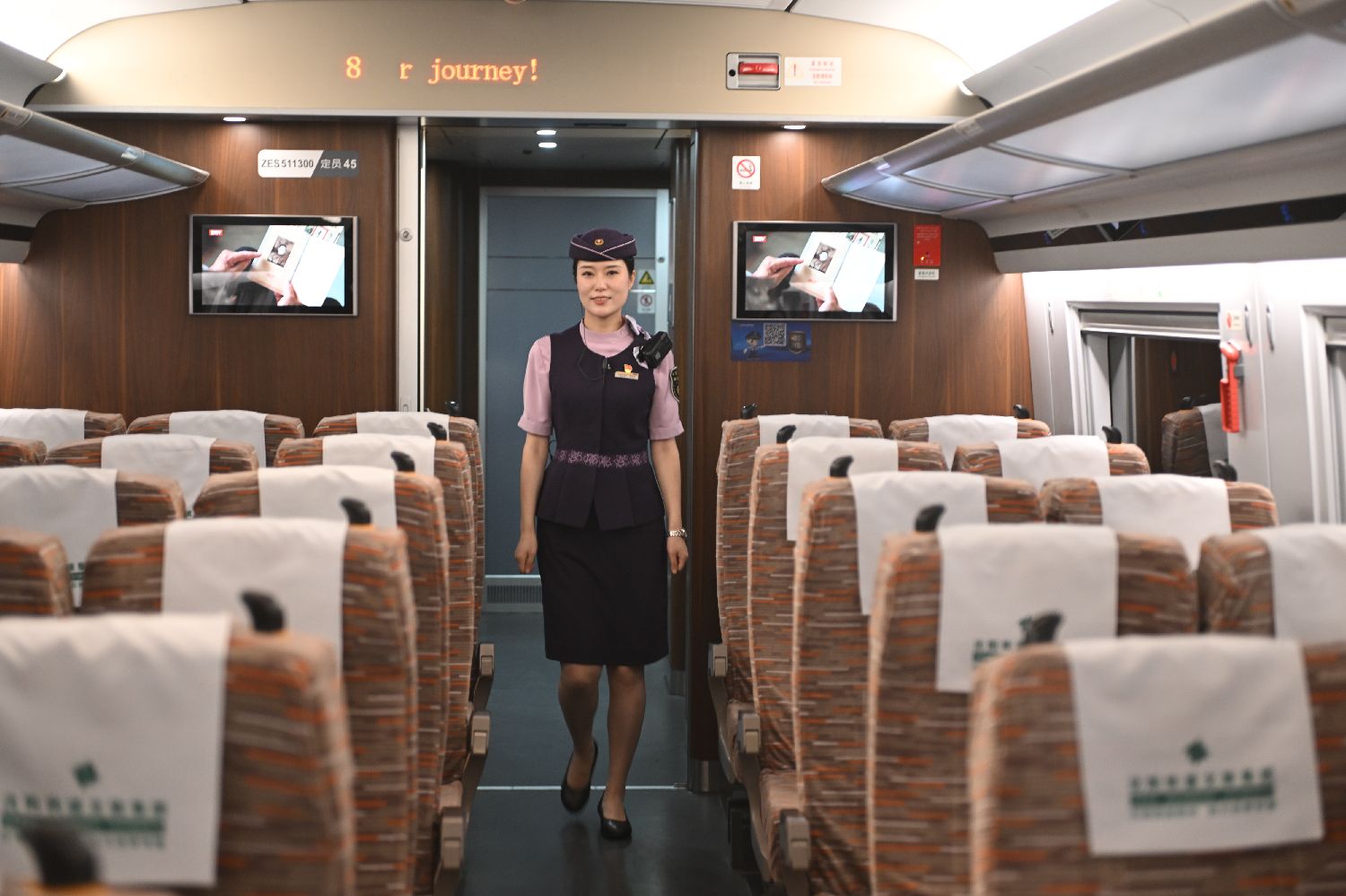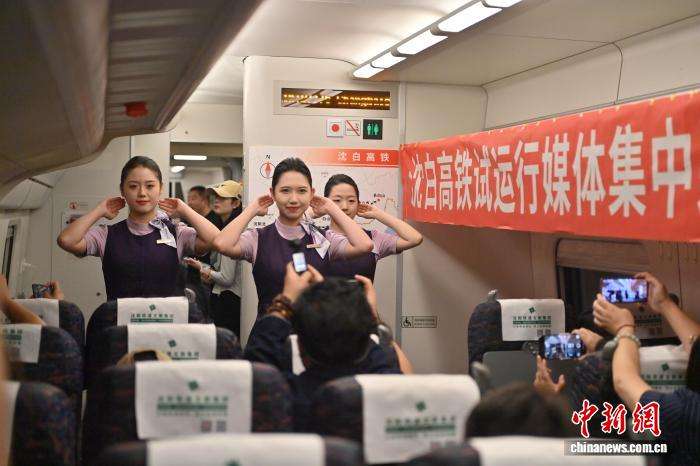 沈白高铁正线起自沈阳北站,沿线经沈阳市、抚顺市、通化市、白山市、延边朝鲜族自治州等5个地市(州),终至长白山站,全长约430公里,设计时速350公里,北京至长白山最短旅行时间将缩至4小时33分。图为列车工作人员表演服务手势操。(图片来源:中新网)