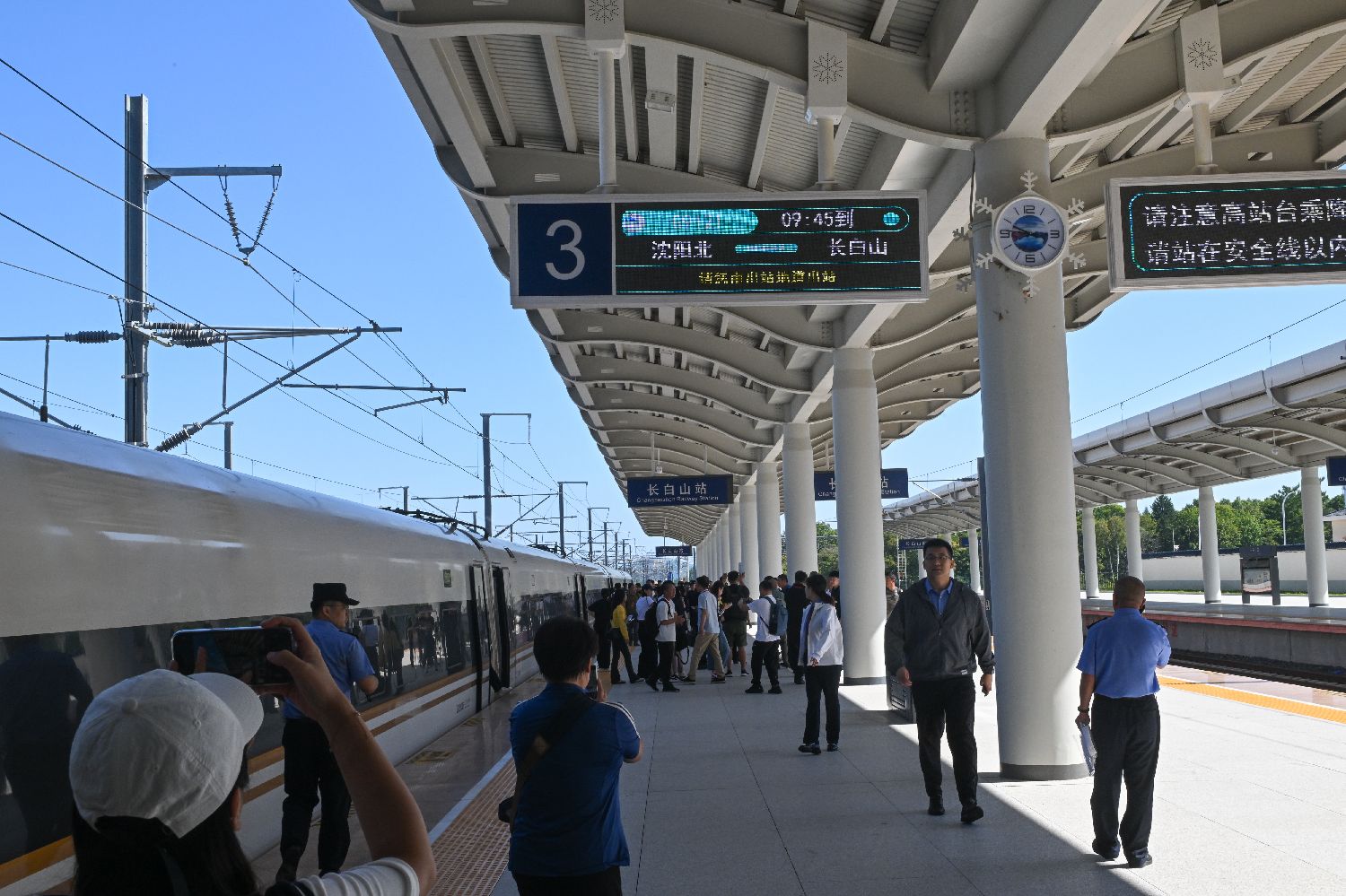 图为G9121次列车抵达长白山站。(图片来源:中新社)