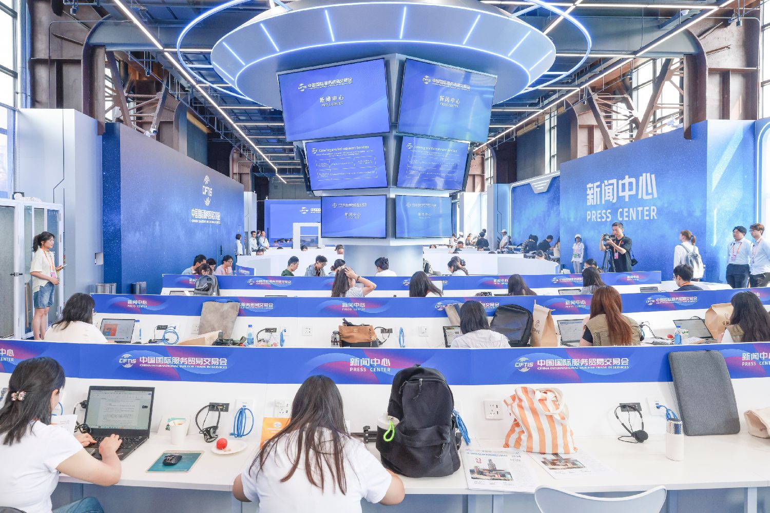图为9月10日,媒体记者在新闻中心内工作。