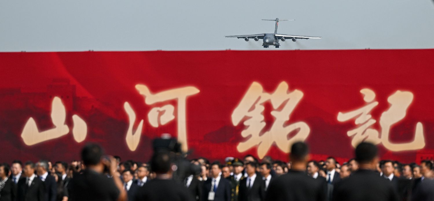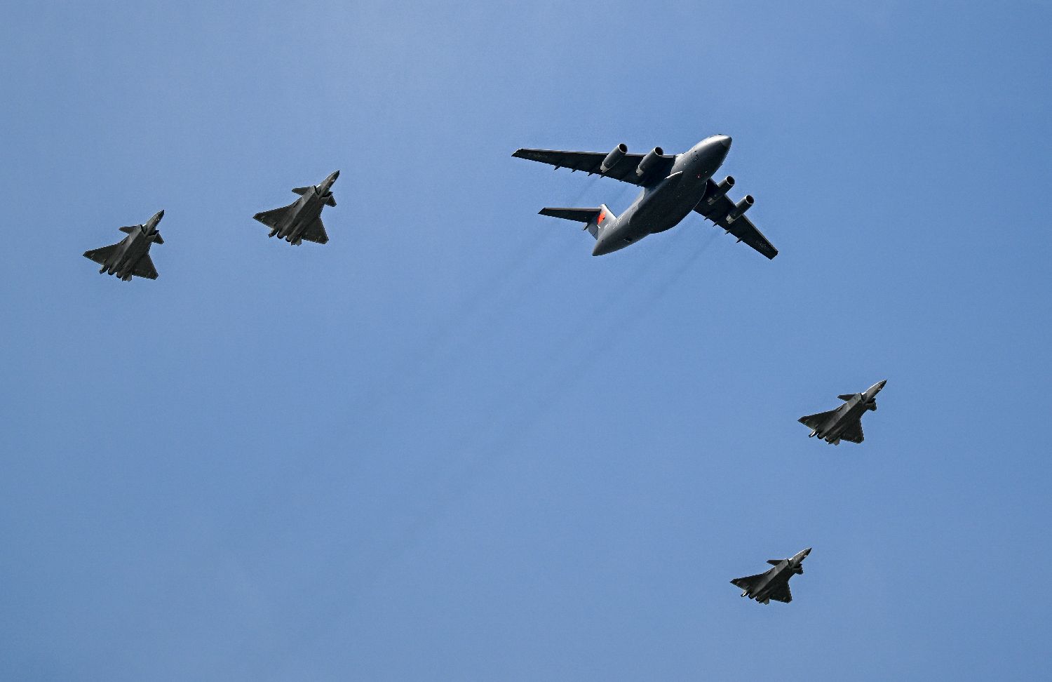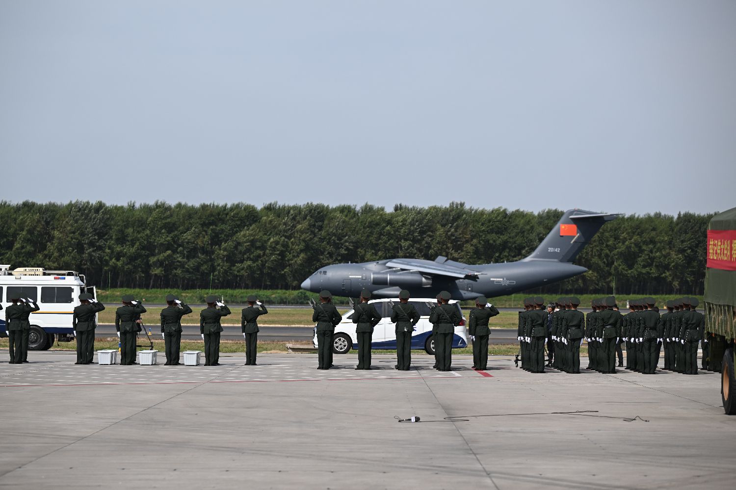 9月12日,第十二批在韩中国人民志愿军烈士遗骸迎回仪式在辽宁沈阳举行。30位在韩中国人民志愿军烈士英灵及267件遗物,由中国空军专机从韩国接回祖国并护送至辽宁沈阳。图为接运烈士遗骸回国的运-20专机在4架歼-20飞机伴飞护航下即将降落。(图片来源:本文图片均来自中新社)