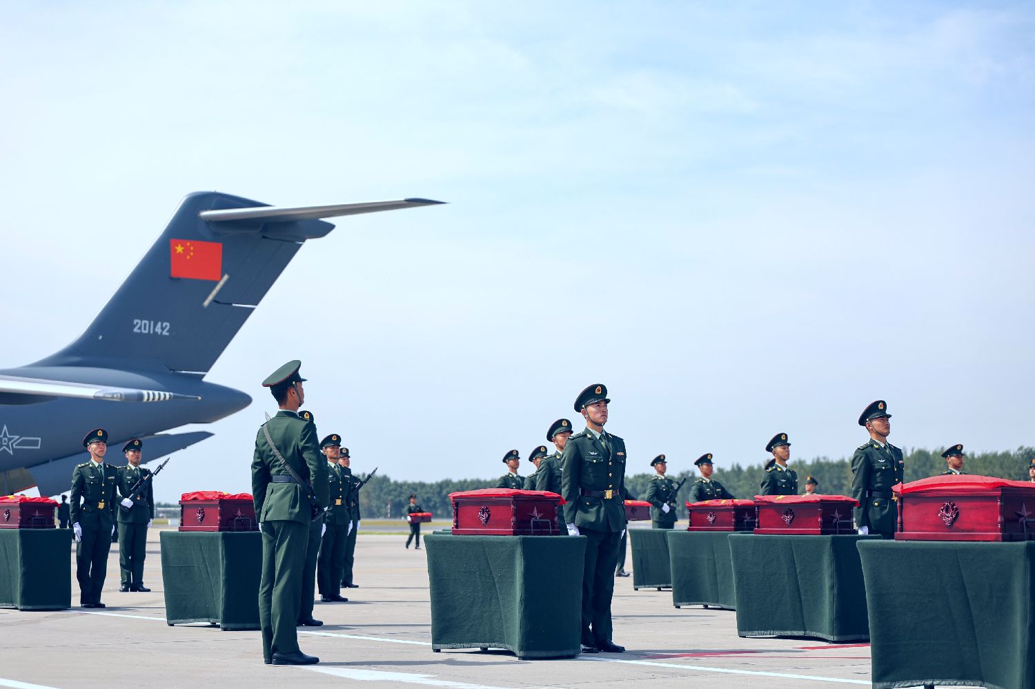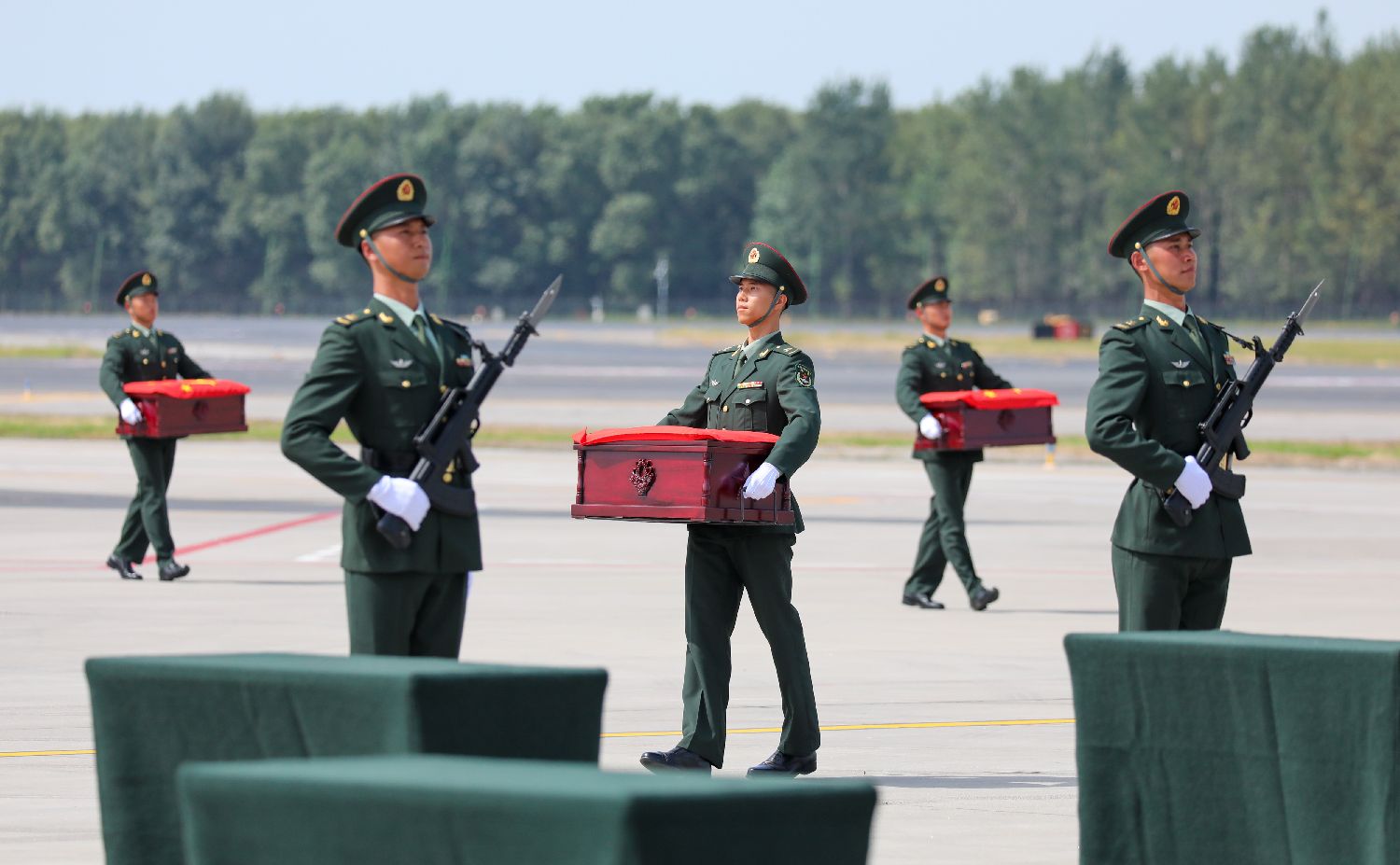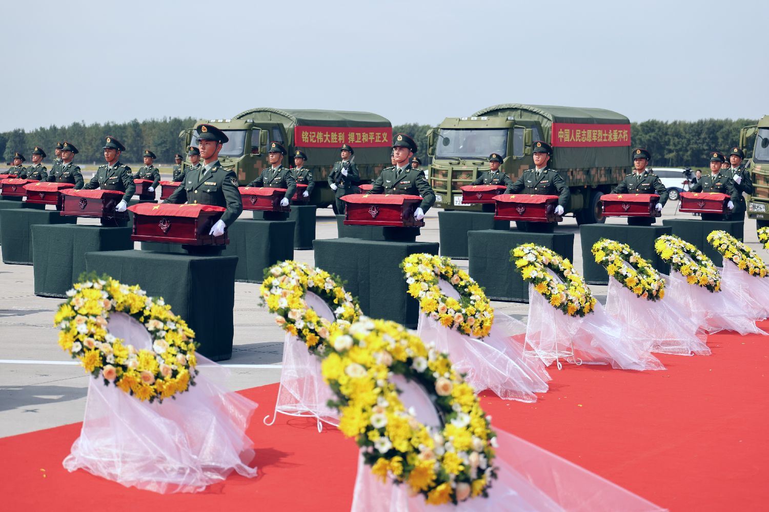 图为礼兵将殓放志愿军烈士遗骸的棺椁从专机上护送至棺椁准备区。