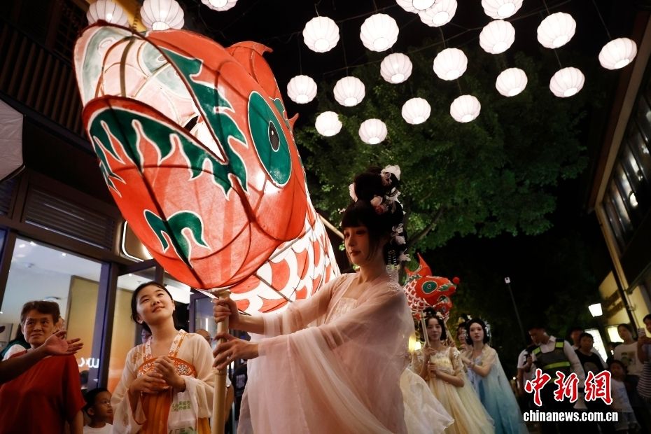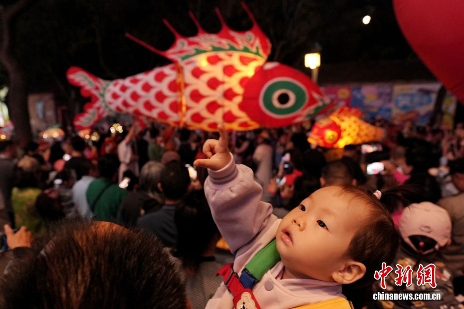 10月6日是中国传统佳节中秋节,一场非遗鱼灯巡游在北京长辛店国潮街区上演。图为小朋友观看鱼灯。(图片来源:本文图片均自中新网)