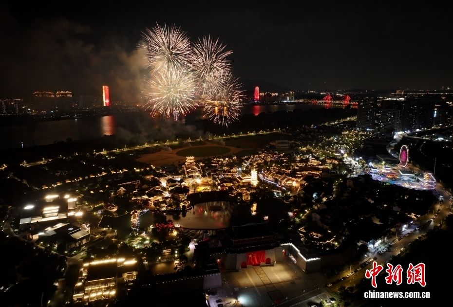 10月6日晚,福建福州闽越水镇举办焰火秀喜迎中秋佳节。