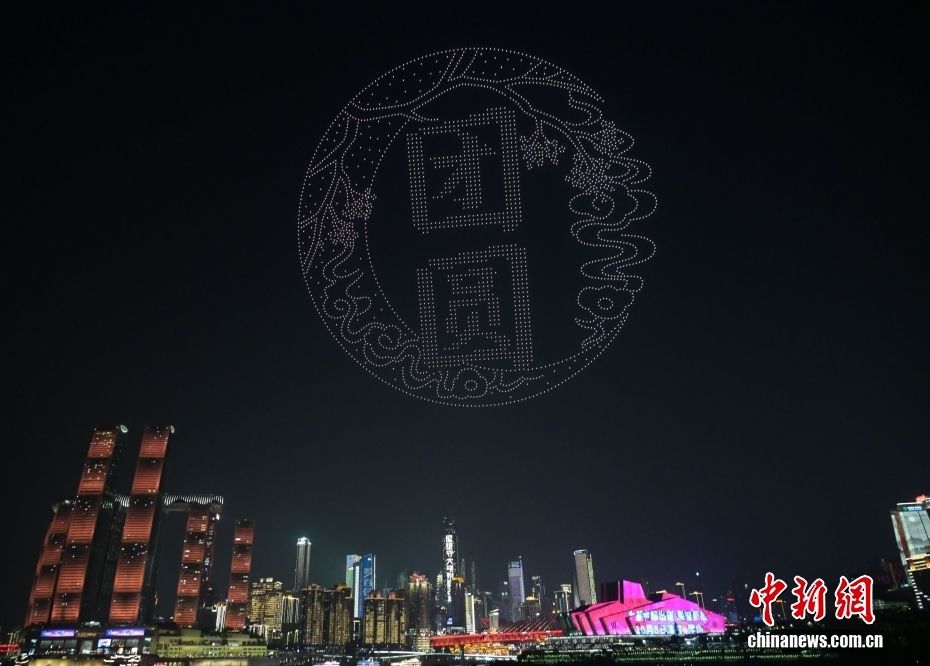 10月6日,重庆“两江四岸”上演无人机灯光秀,数千架无人机在山城夜空中勾勒出“天涯共此时”“月饼圆圆甜又香”“大展鸿‘兔’”“星语星愿”“月满人团圆”等一幅幅绚丽画面,在为市民和游客送上中秋节日祝福的同时,也献上了一场科技与艺术交融的视觉盛宴。图为无人机在空中排列出“月满人团圆”光影图案,祝愿所有人团圆美满。