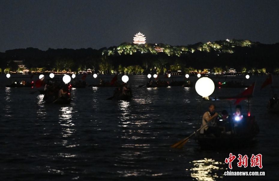 10月6日,在浙江杭州,33艘“月亮船”荡漾西湖湖面上,载着游客夜览西湖“月湖”景观。
