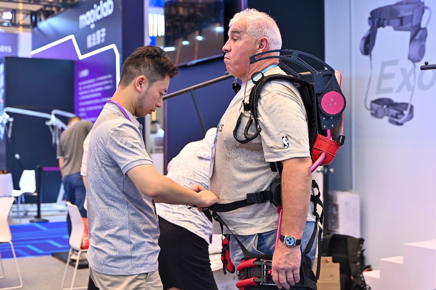 10月15日,第138届中国进出口商品交易会(广交会)在广州开幕。本届广交会第一期以“先进制造”为主题,设立服务机器人专区,聚焦服务机器人前沿,集中展示中国服务机器人最新发展成果。图为采购商体验一款外骨骼助力设备。(图片来源:本文图片均自中新社)