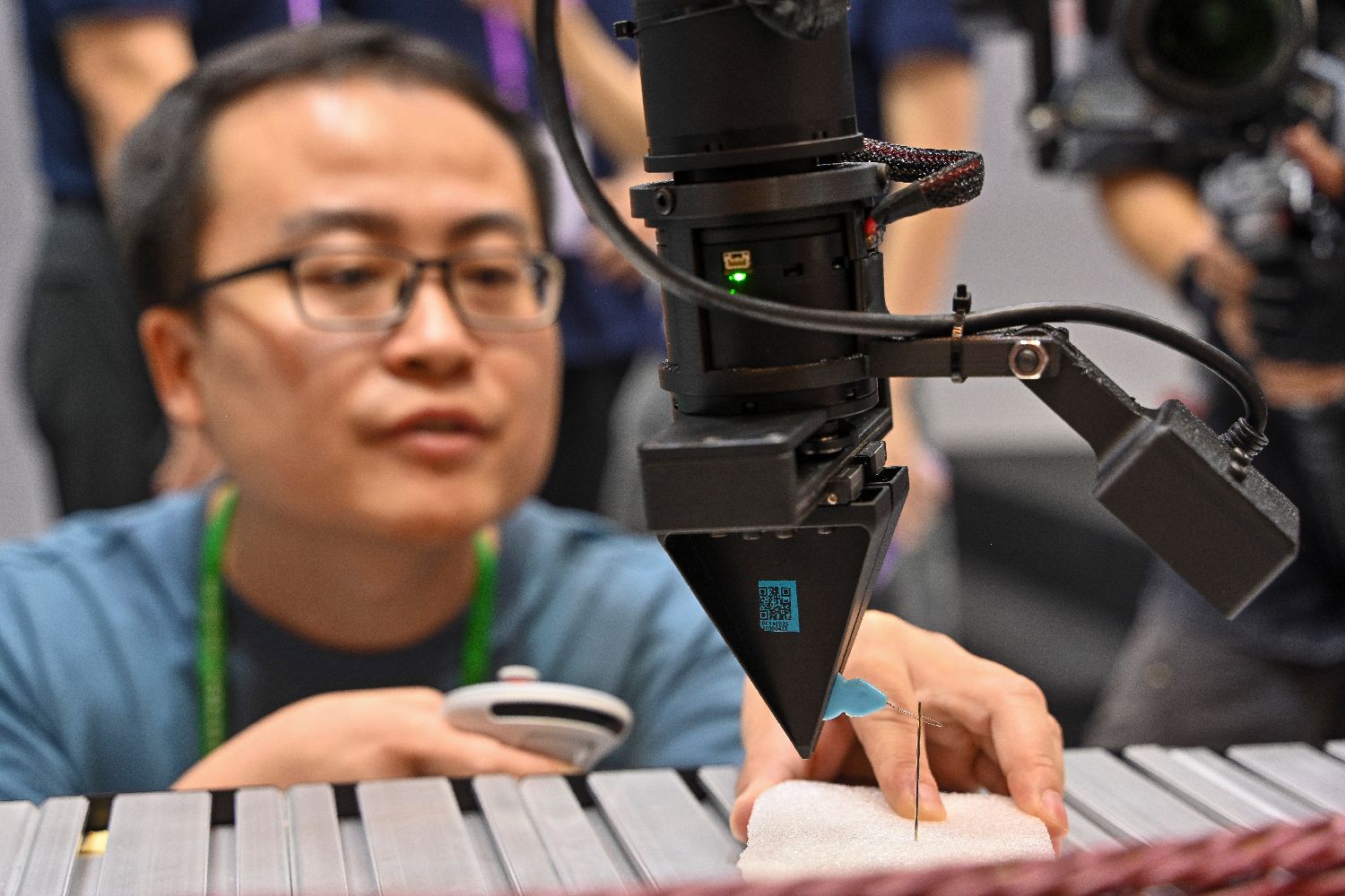 10月15日,第138届中国进出口商品交易会(广交会)在广州开幕。图为参展商操控智能柔性机械臂穿针。