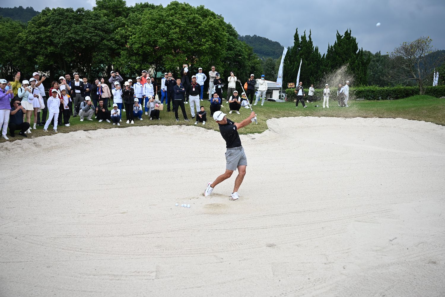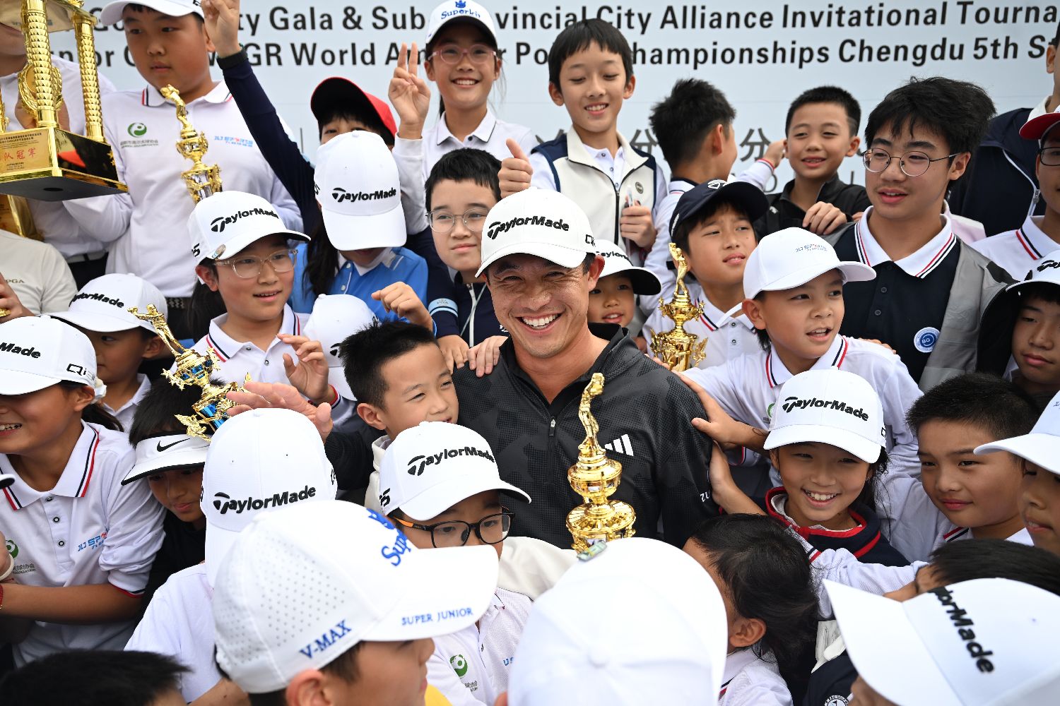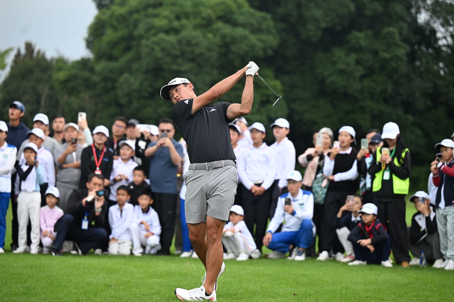 10月19日,中国青少年高尔夫慈善盛典暨副省级城市联盟邀请赛在四川省成都市青城山举行,来自美国的高尔夫球名将科林·森川亮相球场,并与参赛的青少年一起挥杆、交流。图为科林·森川在球场上向青少年高尔夫球运动员示范与互动教学。(图片来源:本文图片均自中新社)