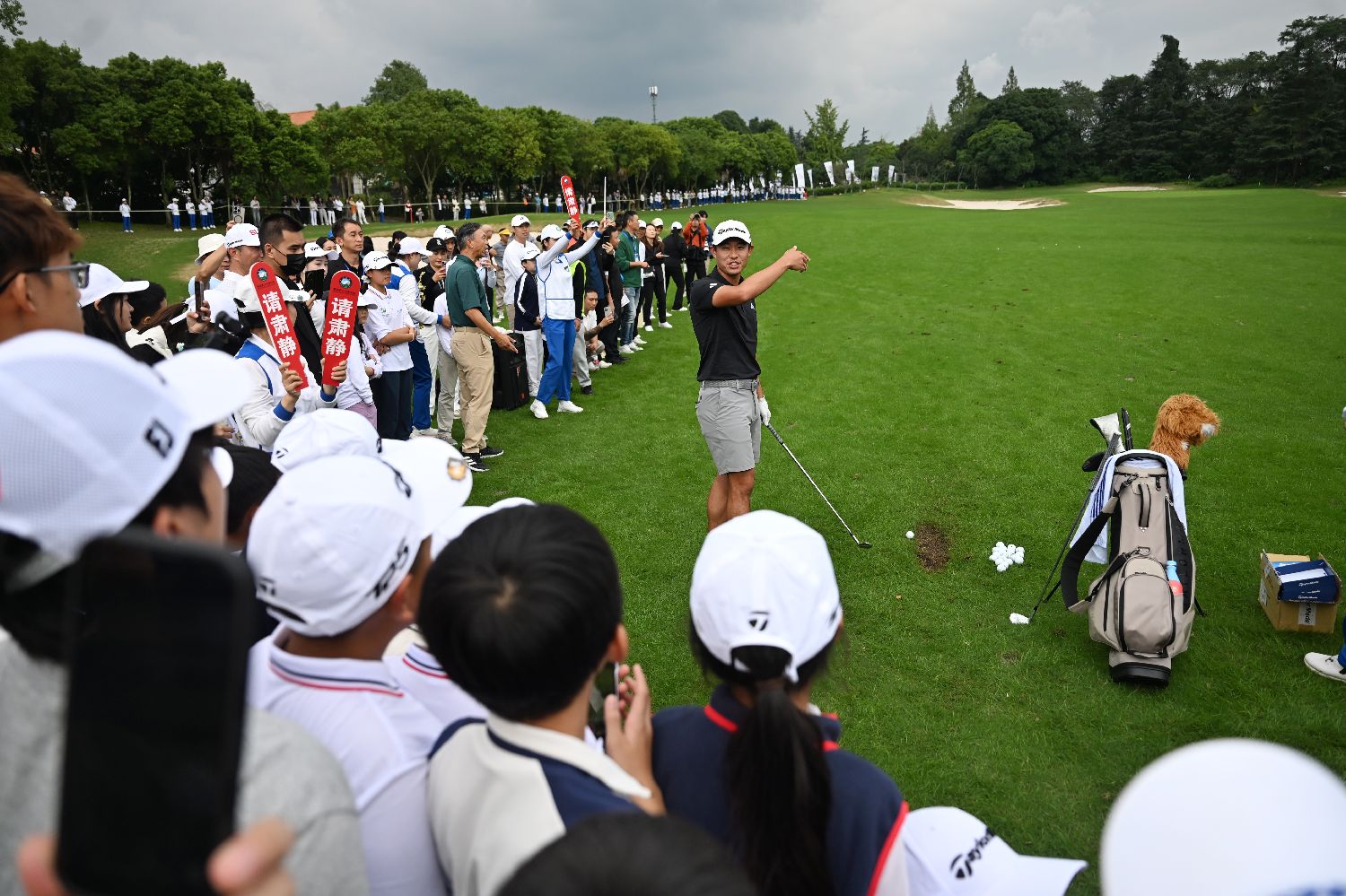 10月19日,科林·森川在球场上向青少年高尔夫球运动员示范与互动教学。