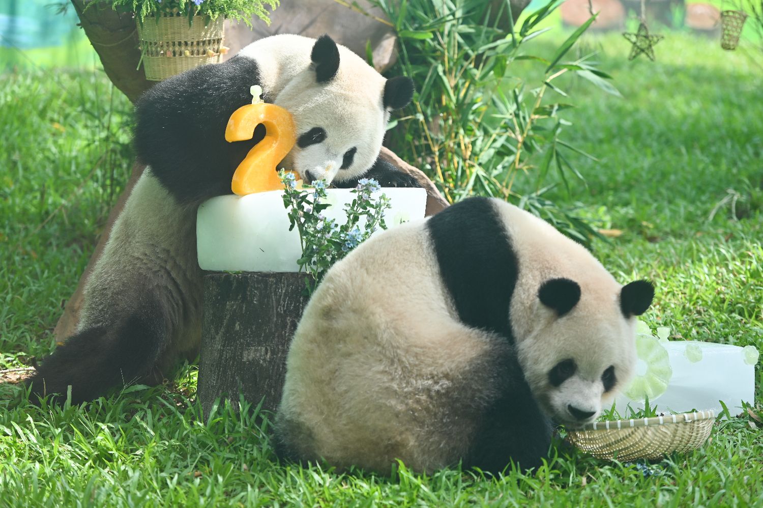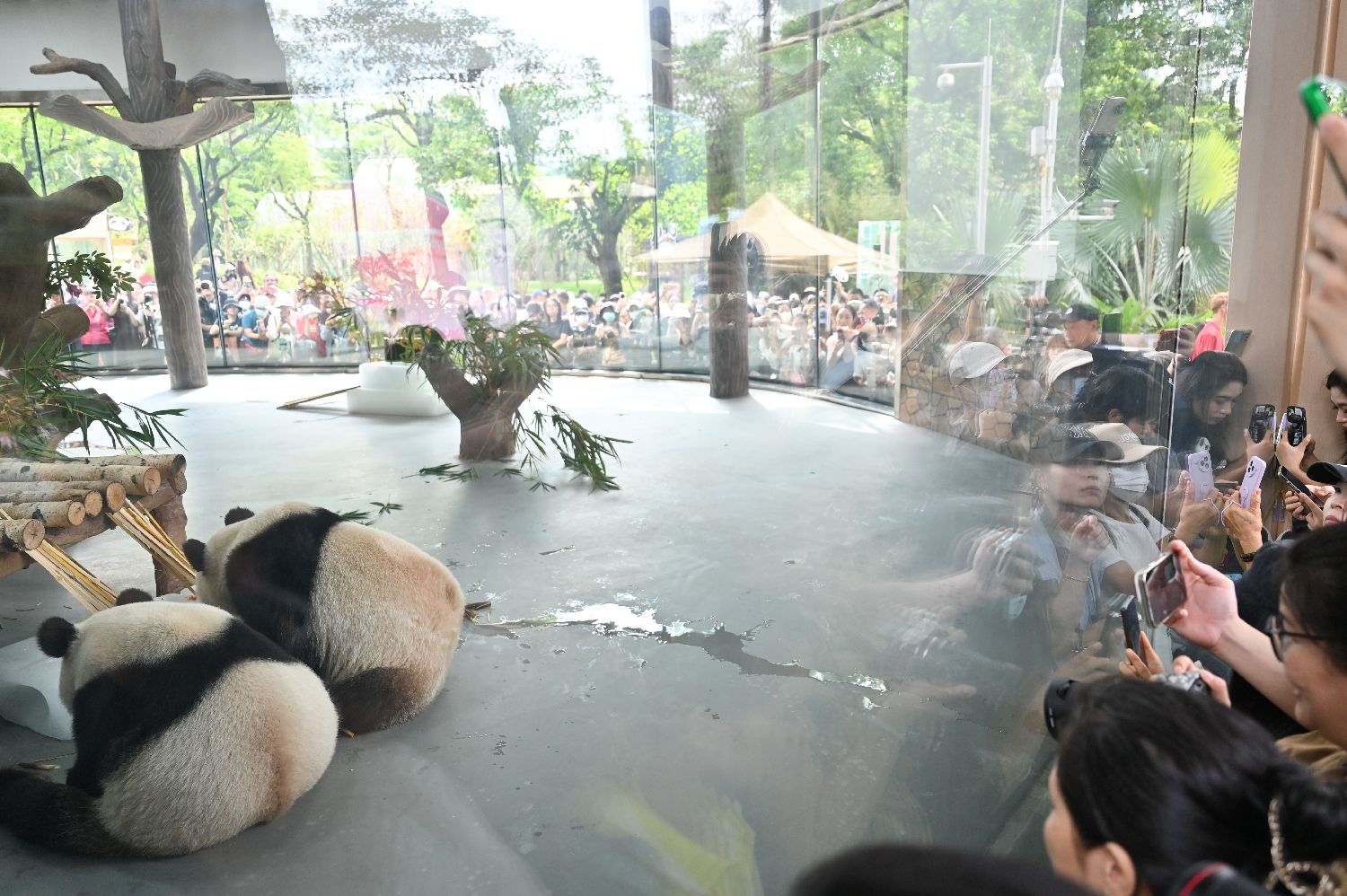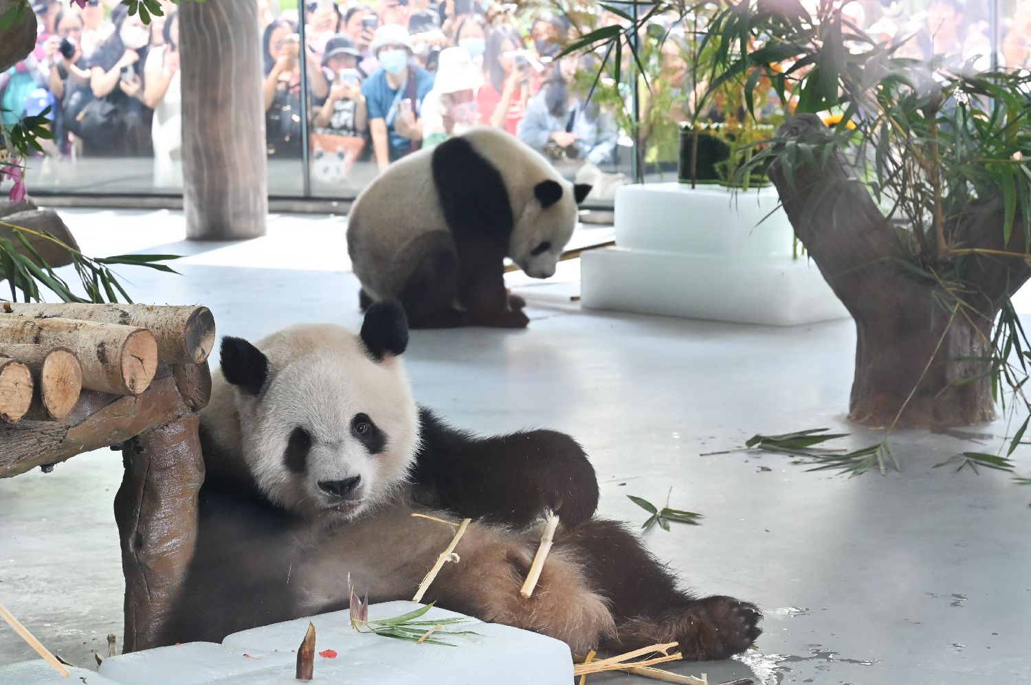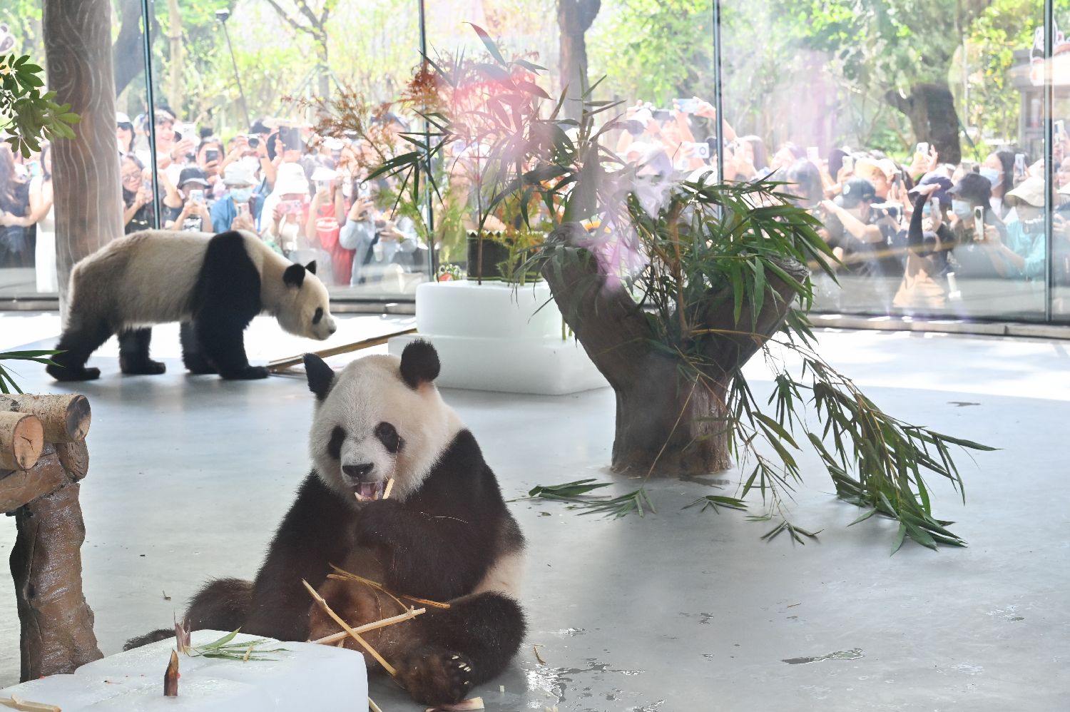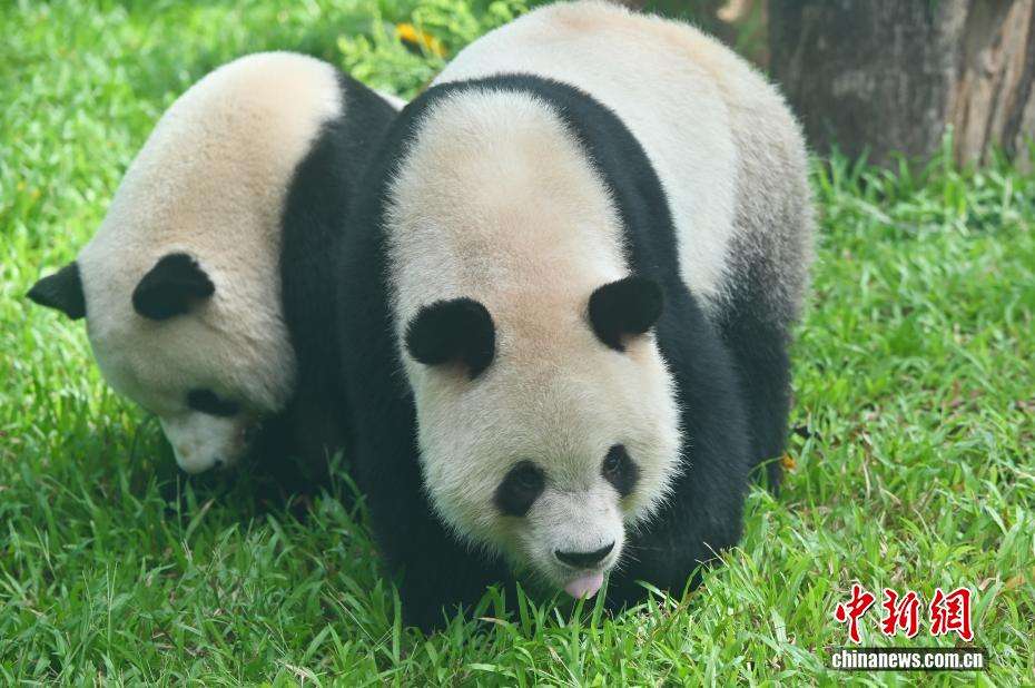 大熊猫“久久”“友友”在新大熊猫馆“遛弯”。(图片来源:中新网)