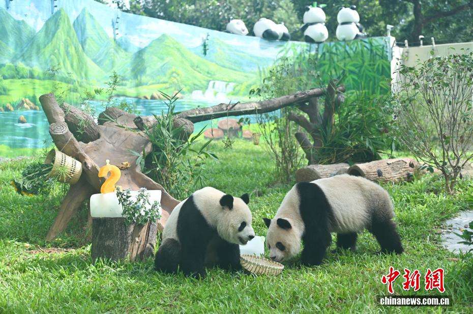 大熊猫“久久”(右)“友友”在新大熊猫馆玩耍。(图片来源:中新网)