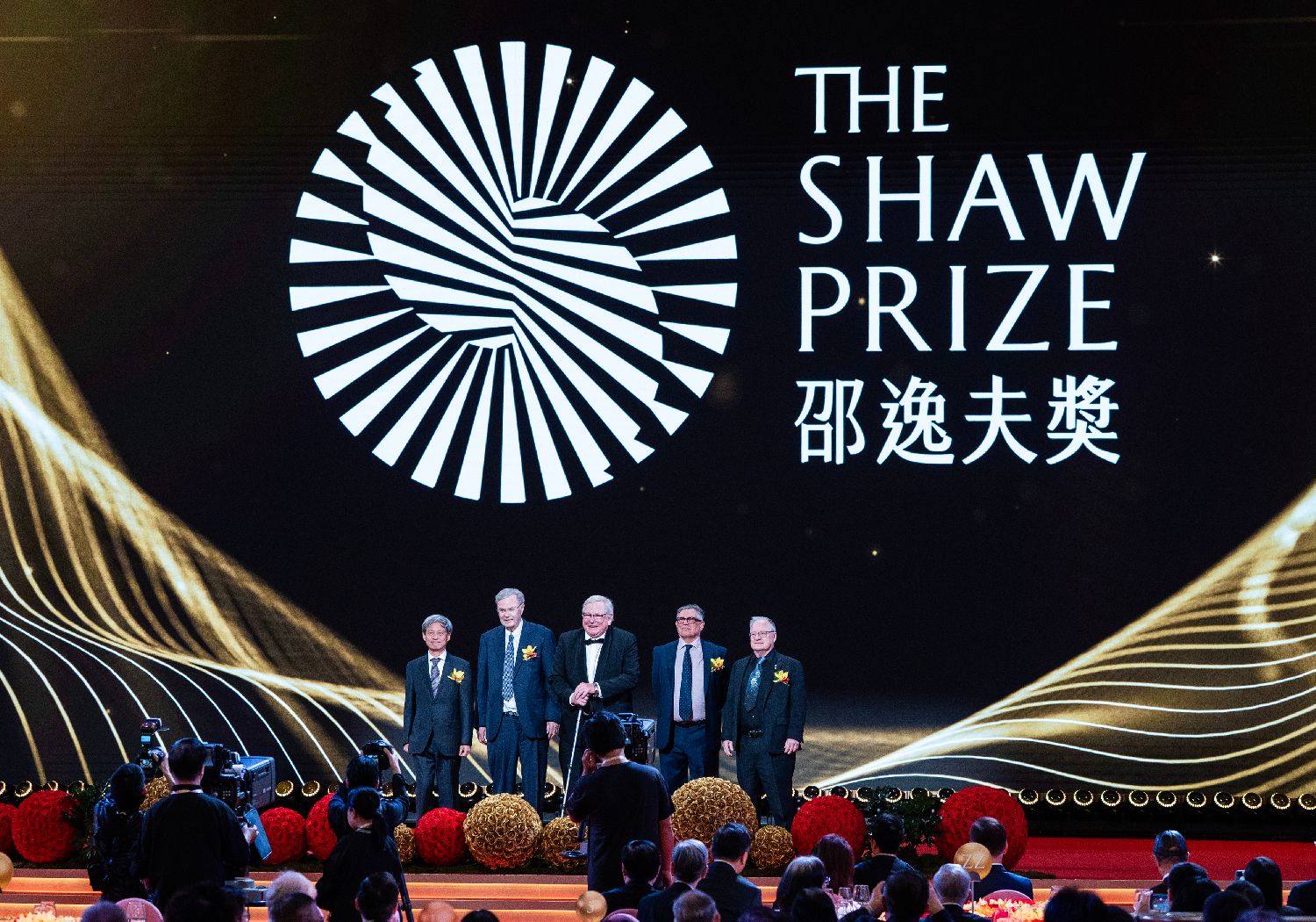 10月21日晚,2025年度邵逸夫奖颁奖典礼在香港会议展览中心大会堂举行,约翰·理查德·邦德和乔治·埃夫斯塔西奥乌获天文学奖;沃尔夫冈·鲍迈斯特获生命科学与医学奖;深谷贤治获数学科学奖。图为邵逸夫奖评审会主席莱因哈德·根舍(中)与各奖项获奖者合影。(图片来源:本文图片均自中新社)