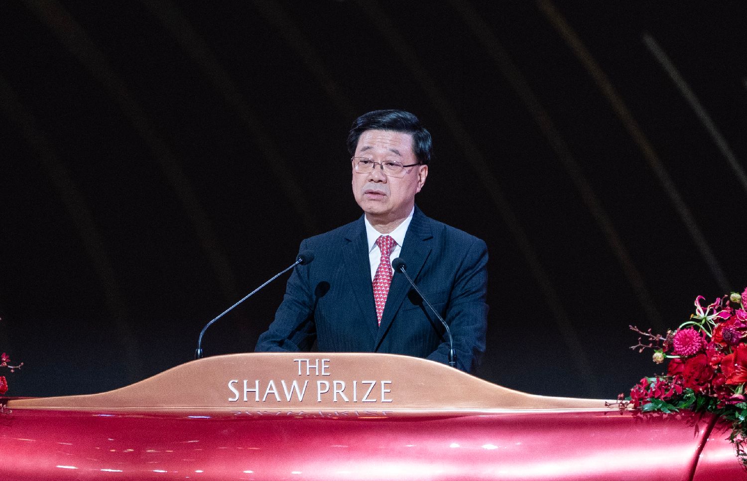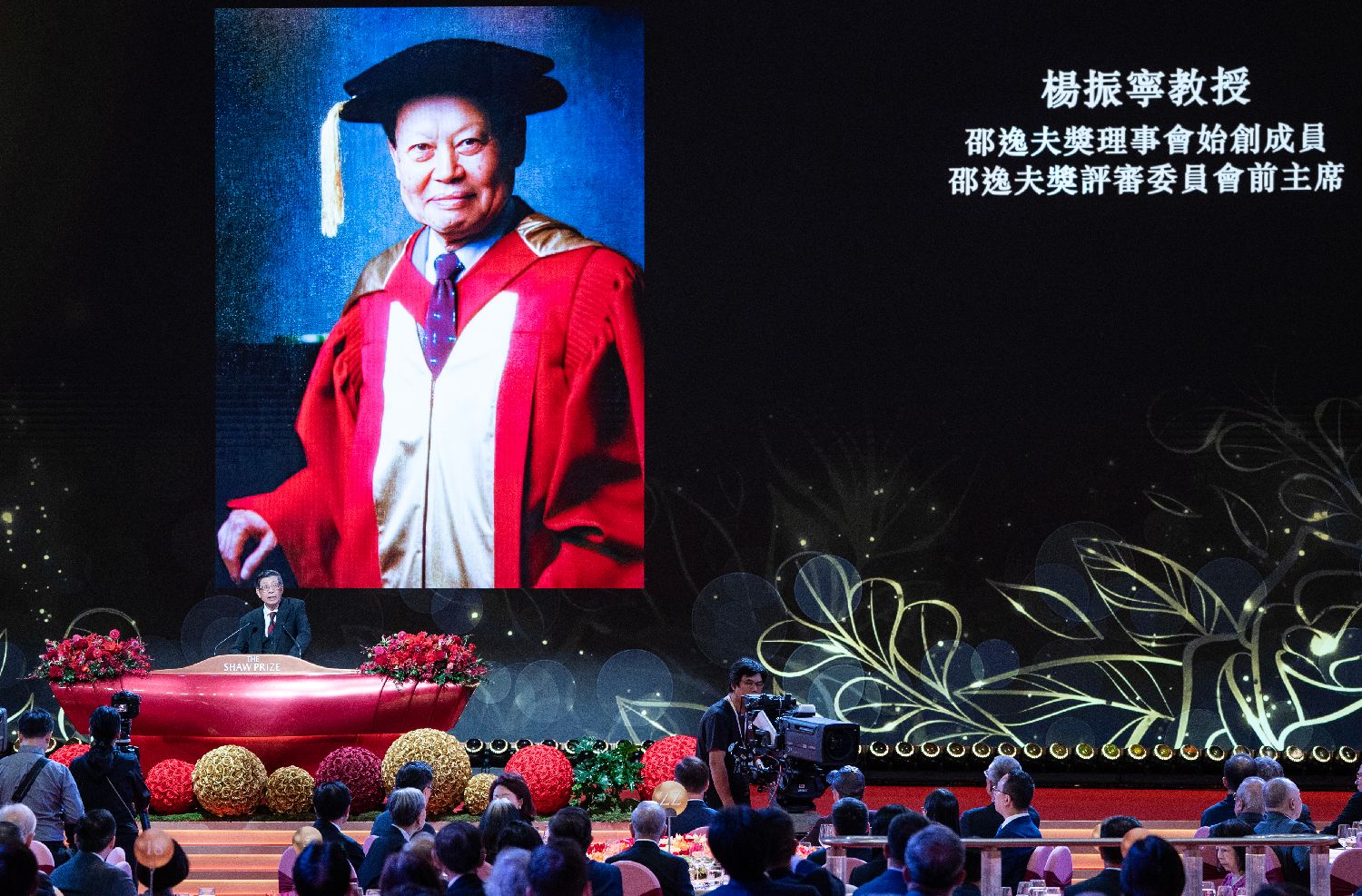 10月21日晚,2025年度邵逸夫奖颁奖典礼在香港会议展览中心大会堂举行。图为邵逸夫奖理事会主席、评审会副主席杨纲凯代表理事会致辞缅怀已故的杨振宁。