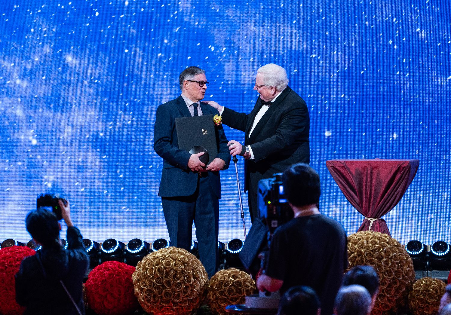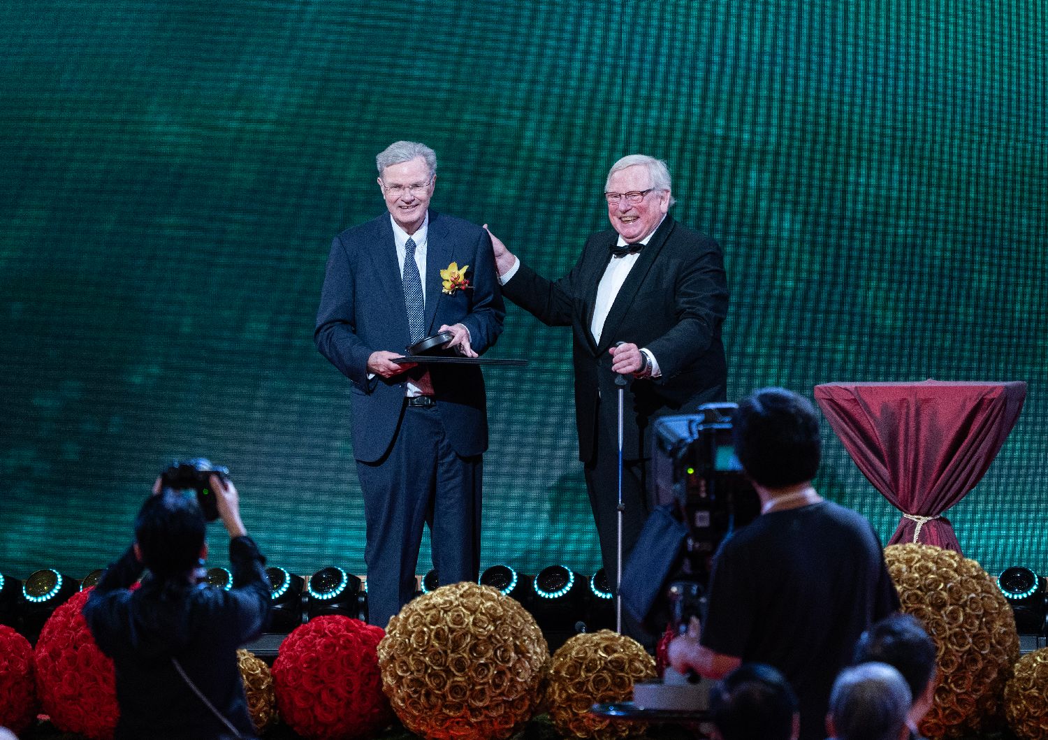 10月21日晚,沃尔夫冈·鲍迈斯特(左)从邵逸夫奖评审会主席莱因哈德·根舍手中接过奖项。