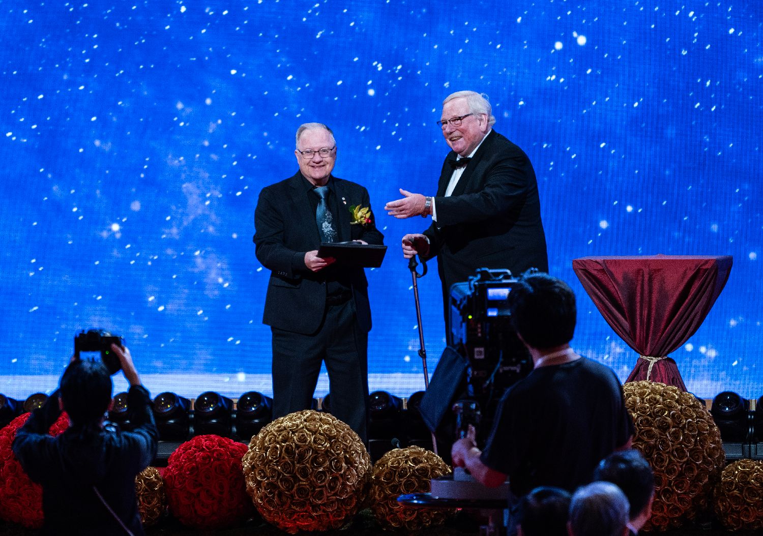 10月21日晚,约翰·理查德·邦德(左)从邵逸夫奖评审会主席莱因哈德·根舍手中接过奖项。