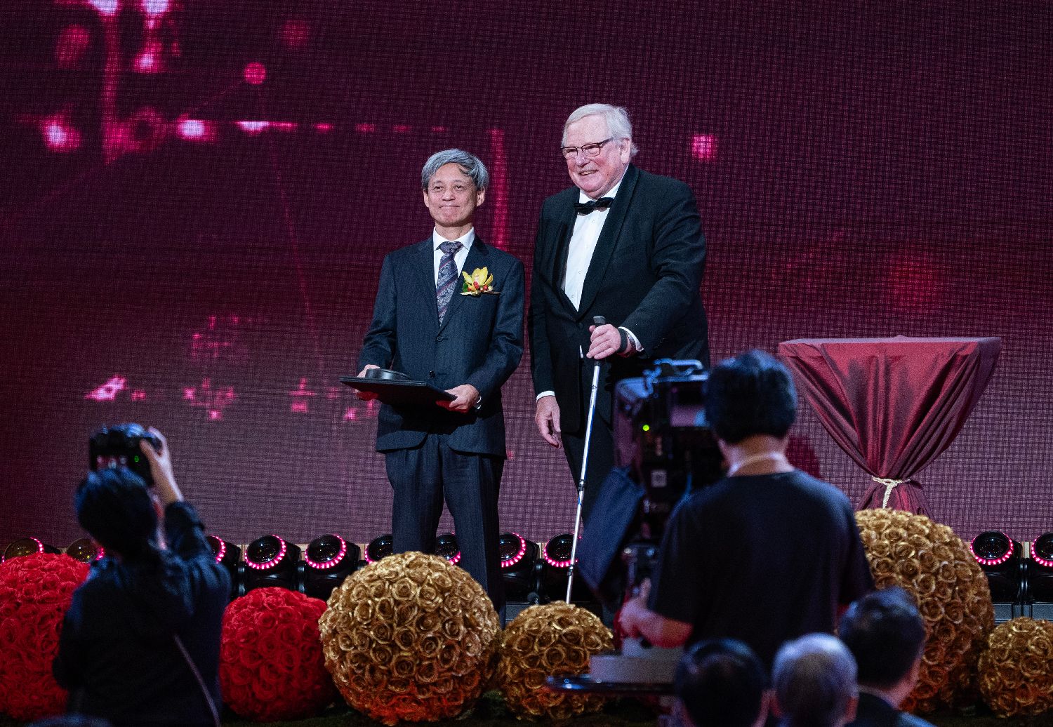 10月21日晚,深谷贤治(左)从邵逸夫奖评审会主席莱因哈德·根舍手中接过奖项。