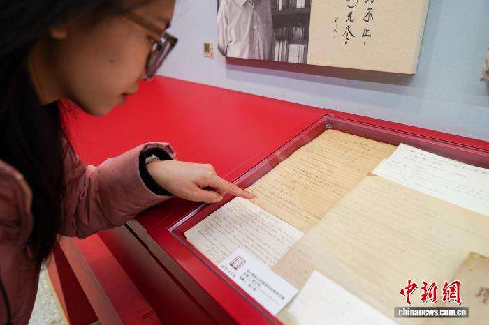 哈军工纪念馆内杨士莪院士四国语言的科研文献手稿吸引学生观看。(图片来源:中新网)