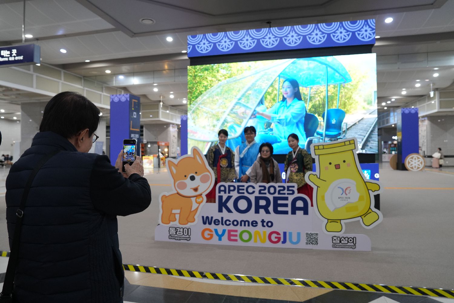 当地时间10月27日,民众在庆州火车站内APEC主题打卡点拍照留念。