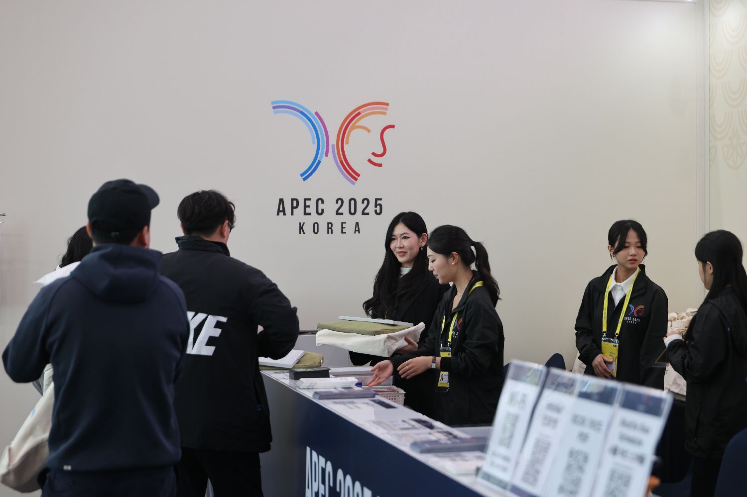 10月28日,APEC国际媒体中心,工作人员发放媒体包。