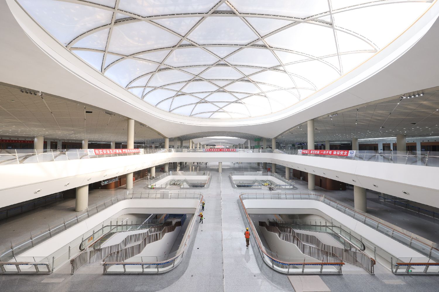 11月13日,北京城市副中心站正在进行装饰装修施工。北京城市副中心站总建筑面积约300万平方米,建成后将成为亚洲最大的地下综合交通枢纽。(图片来源:本文图片均自中新社)