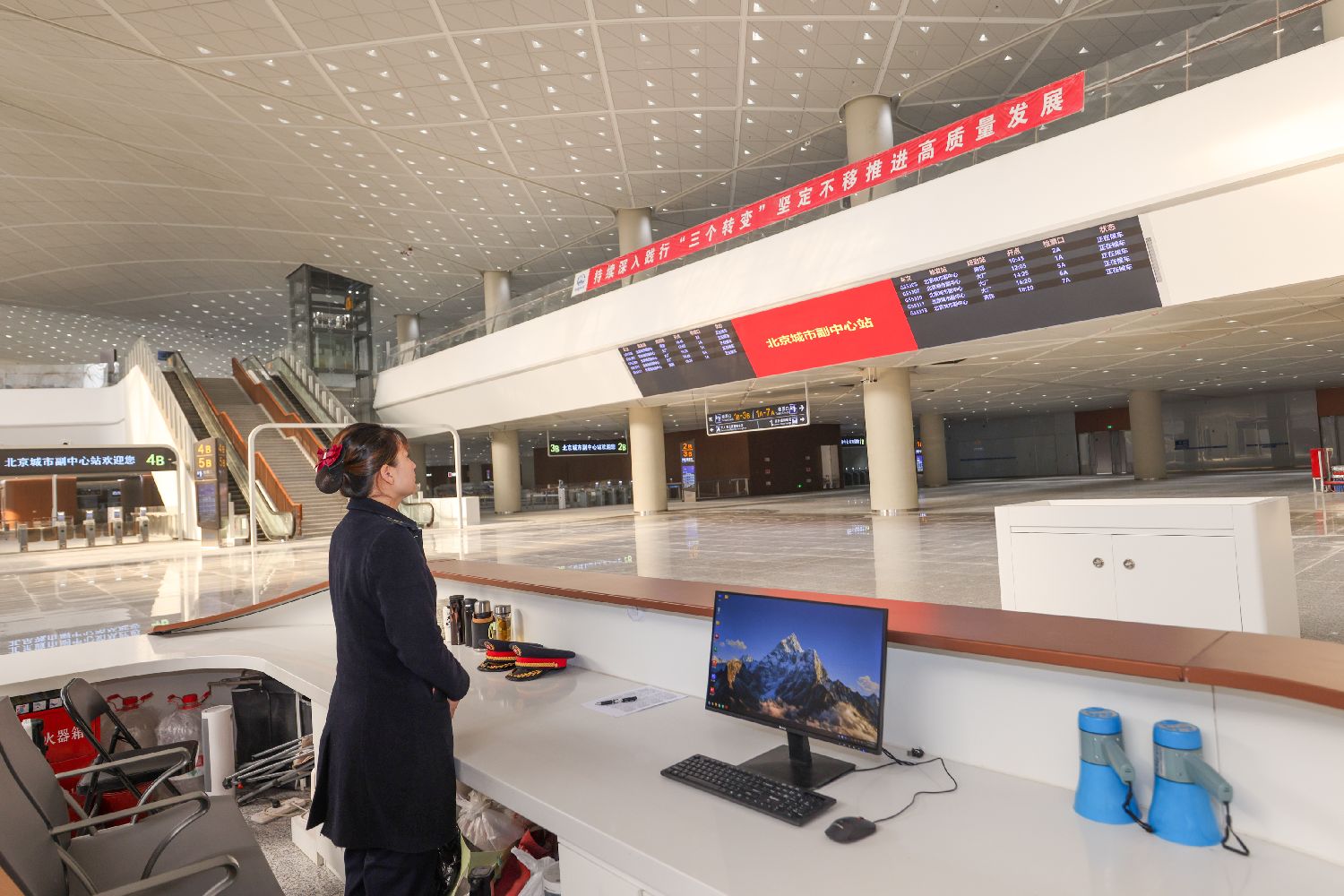 11月13日,北京城市副中心站服务台的工作人员正在进行上岗前的演练。