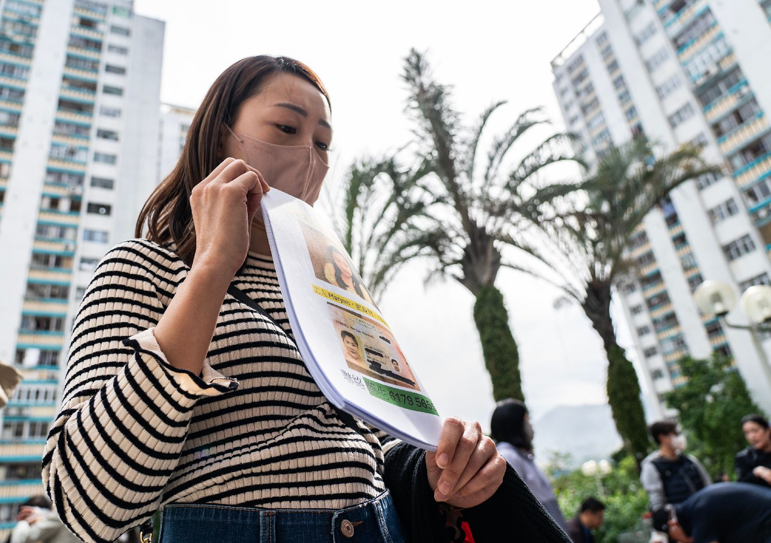11月27日,为宏福苑附近的广福邨公众平台上,一位女士帮助受灾民众分发寻人启事。