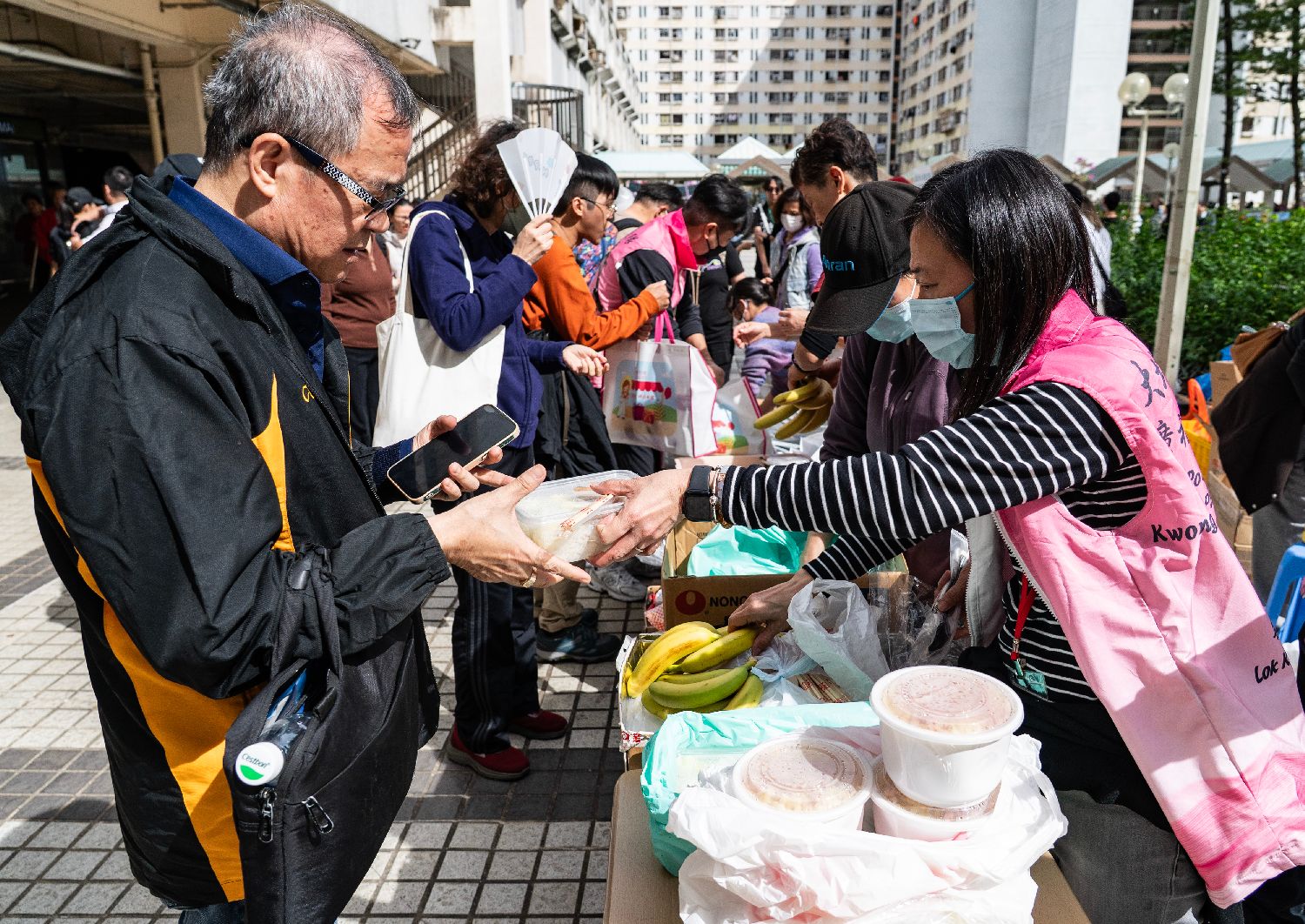 11月27日,香港大埔宏福苑火灾事故发生翌日,社区关爱队、热心市民等各界人士在事故现场附近为需要帮助的市民提供关爱协助。图为宏福苑附近的广福邨公众活动平台上,第十五届全国运动会香港赛区志愿者向有需要者分发水果。(图片来源:本文图片均自中新社)