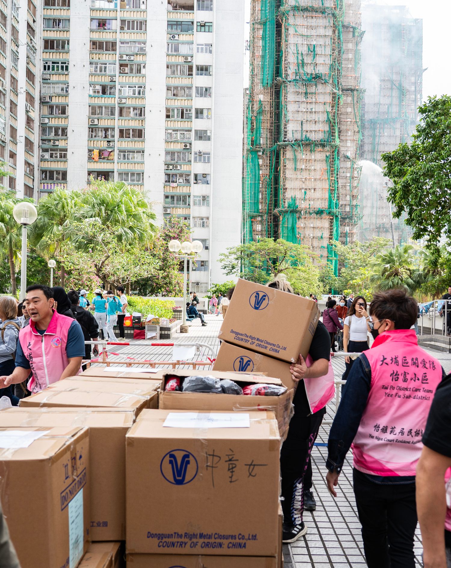 11月27日,宏福苑附近的广福邨公众平台上,社区关爱队和热心市民等在整理纸尿裤等捐赠物资。