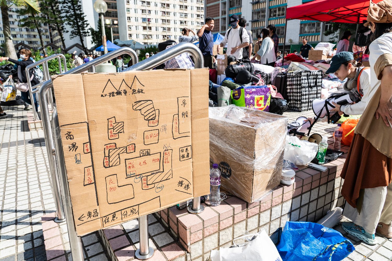 11月28日,香港大埔宏福苑火灾现场附近的广福邨公众活动平台上,社会各界的物资援助、互帮互助有序持续开展。