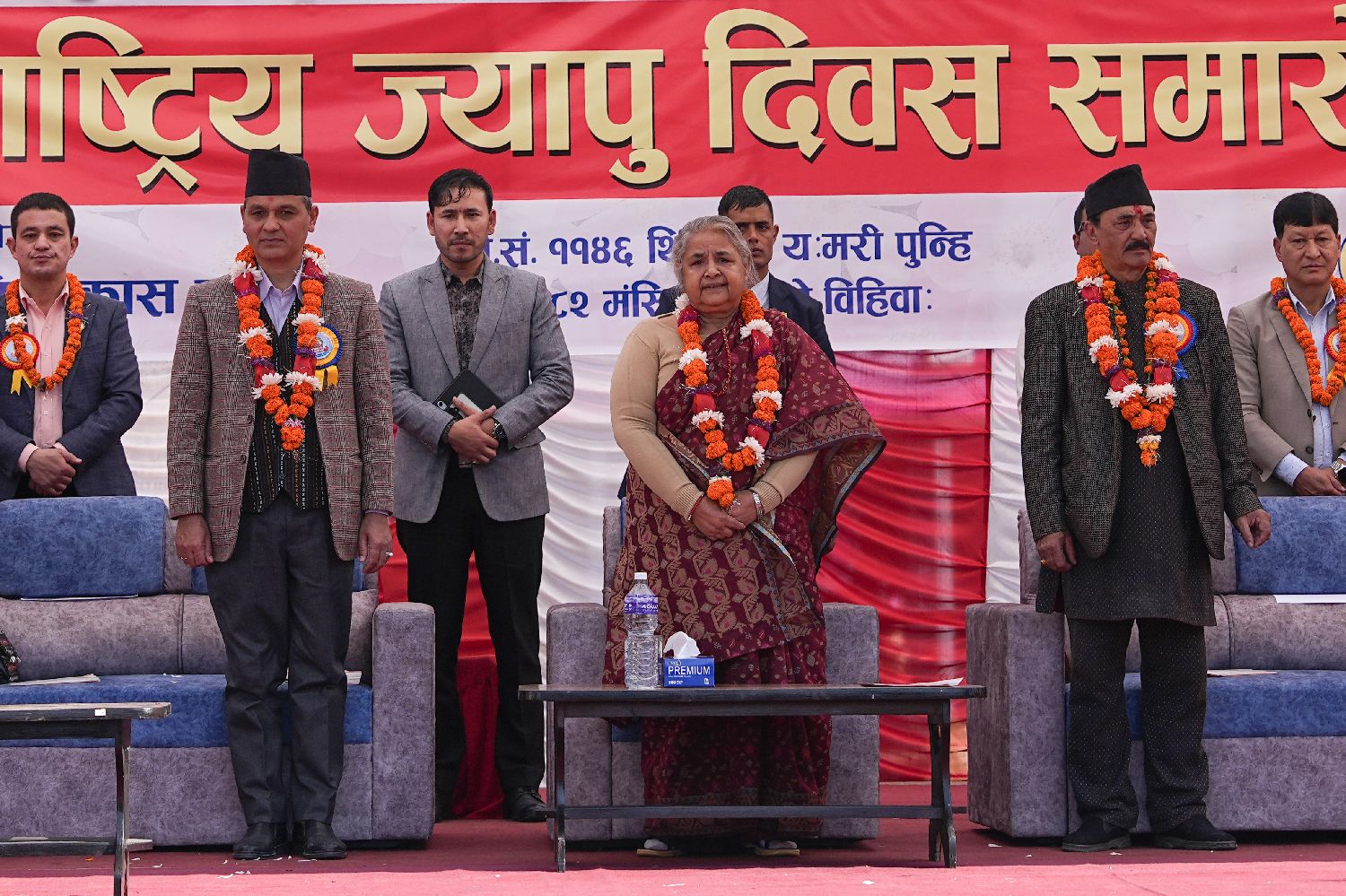 12月4日,尼泊尔民众在加德满都以游行、集会等方式庆祝传统节日尤麻瑞·普什节。图为尼泊尔临时政府总理卡尔基(前中)、内政部长阿亚尔(前左)出席节日庆祝集会。(图片来源:本文图片均自中新社)