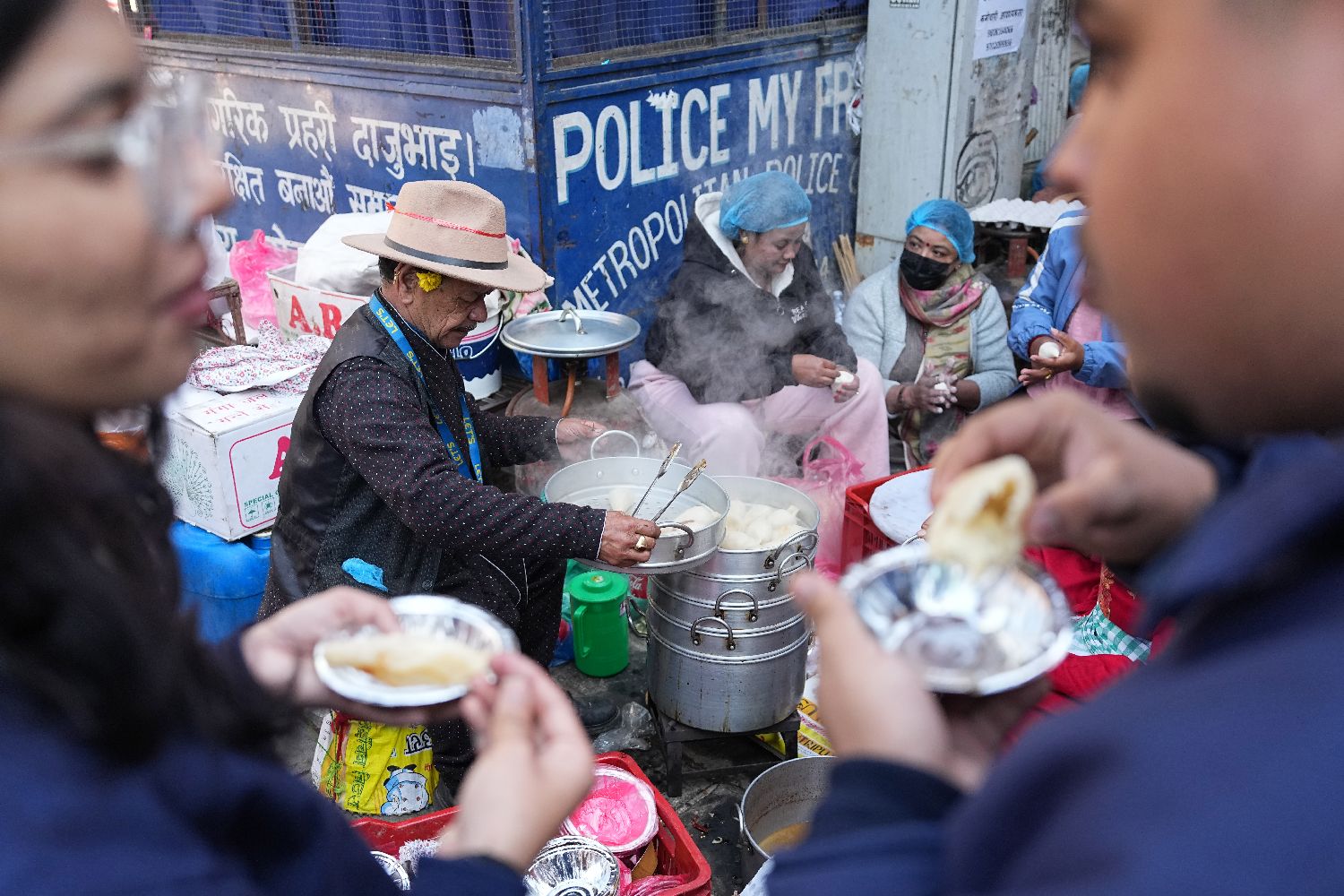 民众在节日期间会食用尤麻瑞等传统食物,并向谷物女神祈福,感恩丰收并祈愿来年好运。图为街头摊贩蒸制尤麻瑞。