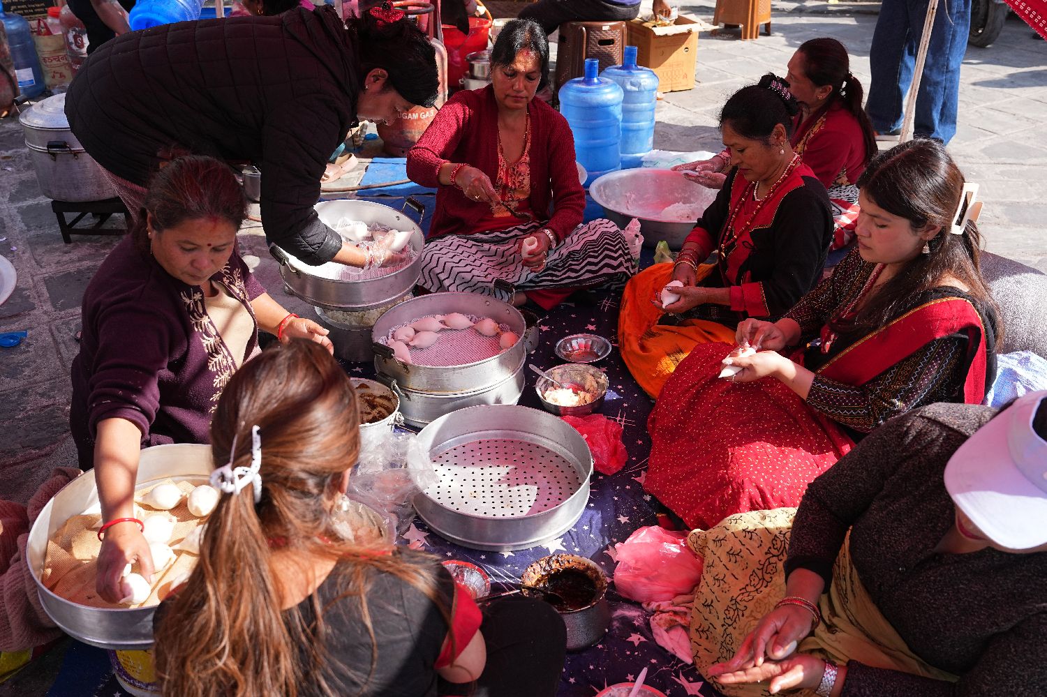 12月4日,尼泊尔妇女围坐制作尤麻瑞。