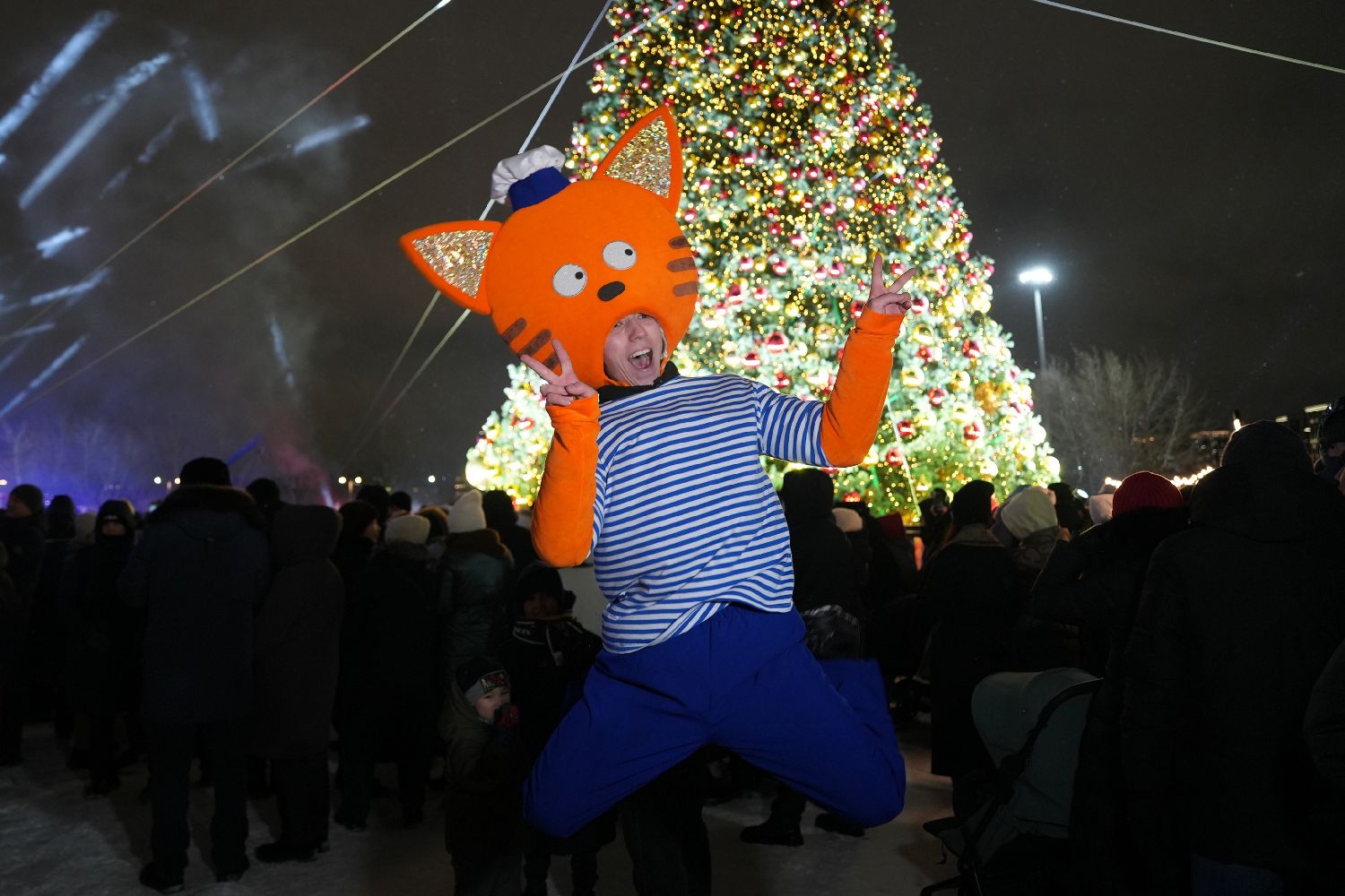 当地时间12月19日晚,身着卡通服装的民众在新年枞树前拍照。