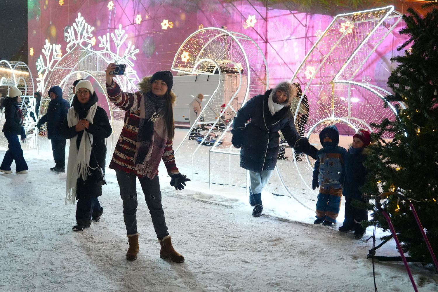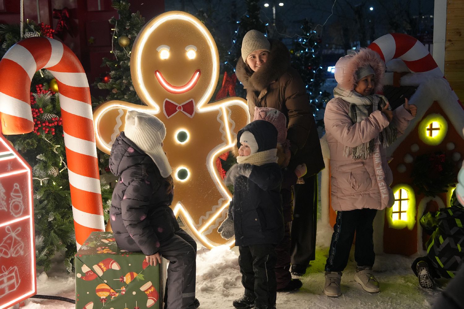 当地时间12月19日晚,新年枞树点亮仪式现场,家长带着孩子在新年主题布景前合影。