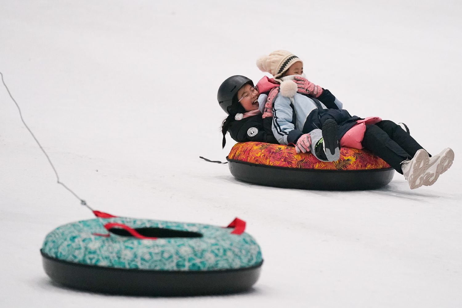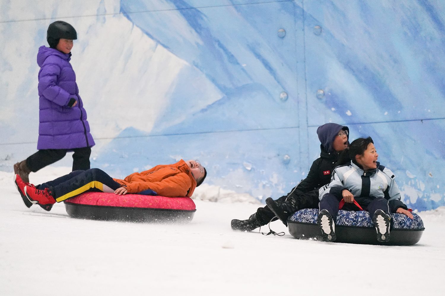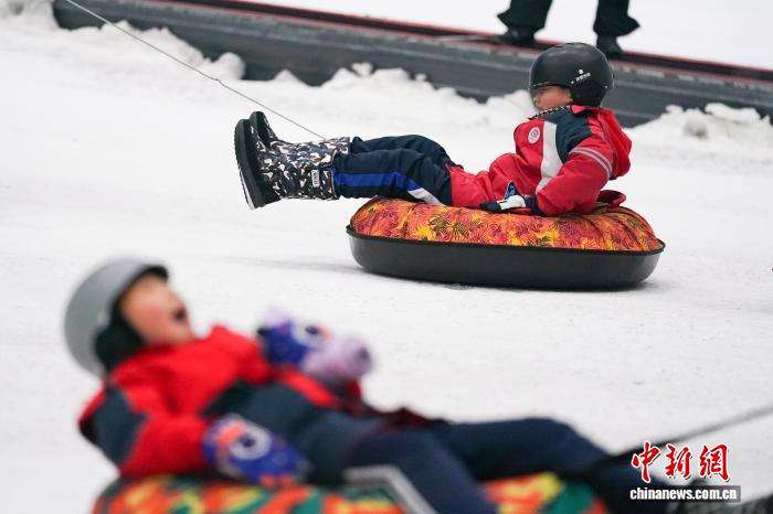 12月24日,哈尔滨新区“百万青少年上冰雪”活动启动仪式暨“冰雪少年亚冬传承”中小学生冬季运动会在哈尔滨热雪奇迹举行。学生们参与比拼高山滑雪、雪圈竞速等5个项目,尽享冰雪乐趣。图为学生们玩雪圈。(图片来源:中新社)