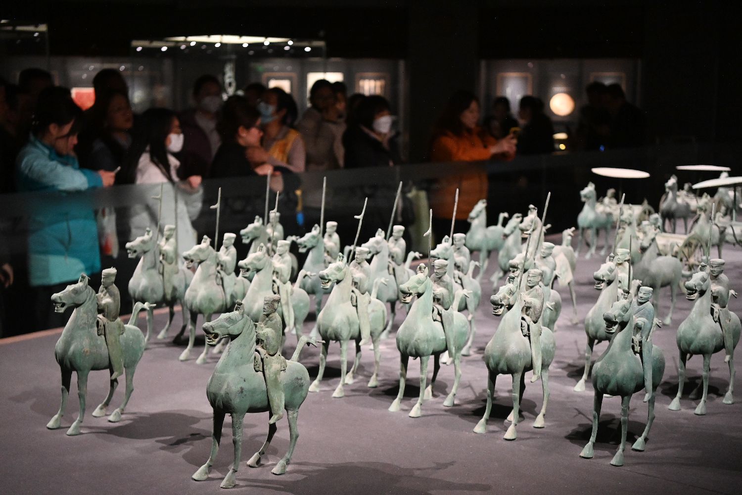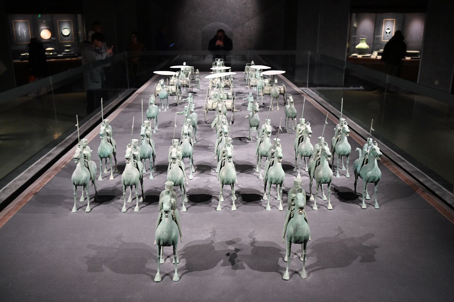 12月24日,在位于兰州的甘肃省博物馆丝绸之路文明展厅内,游客参观武威雷台汉墓出土的铜车马仪仗俑队。作为中华民族和中华文明的重要发祥地之一,甘肃是古丝绸之路的重要通道,遗留下来诸多以马为主题的珍贵文物,真实再现了丝绸之路上的商贸繁荣与文化交融。(图片来源:本文图片均自中新社)